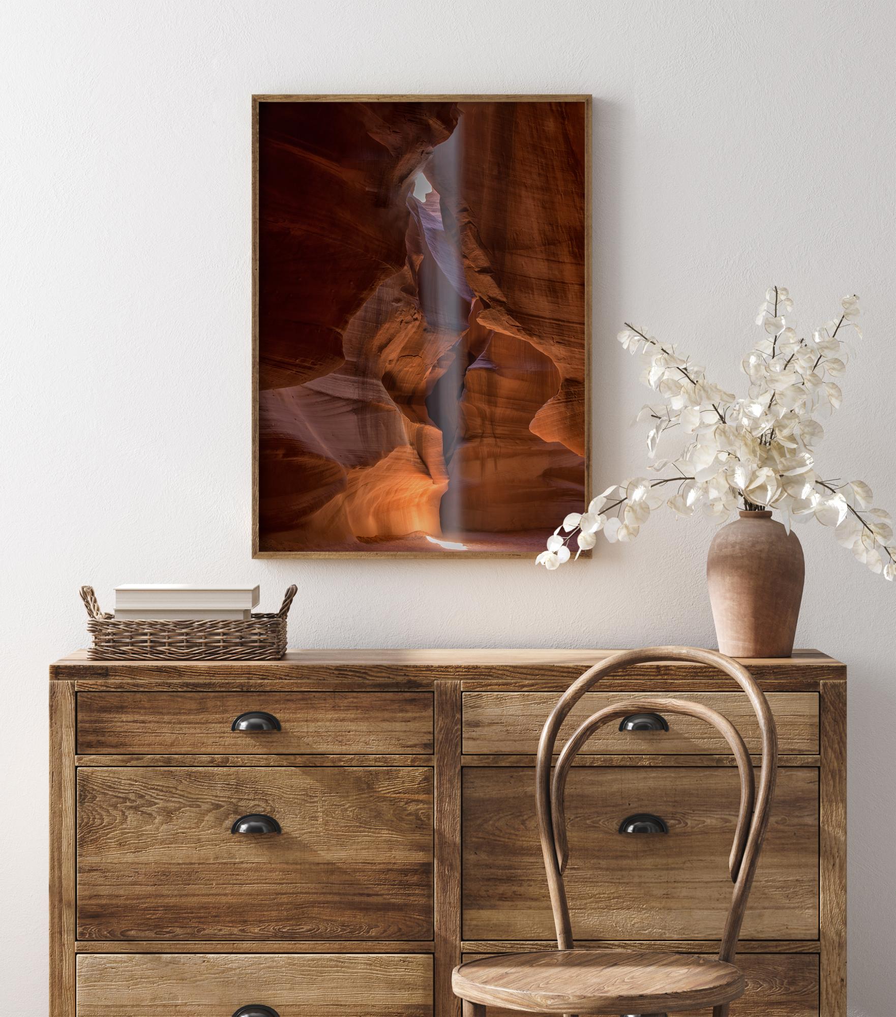 Μια μαγική αφίσα με μια ακτίνα φωτός που ταξιδεύει κάτω από κόκκινους βράχους. Οι μαλακές καμπύλες των κόκκινων βράχων δημιουργούν μια ζεστή λάμψη. Η μοναδική ακτίνα φωτός δίνει μια μαγική ατμόσφαιρα σε αυτό το κλειστό δωμάτιο και φωτίζει περαιτέρω τους μαλακούς βράχους. Πάρτε αυτό το έργο σπίτι σας για ένα δραματικό συμπλήρωμα στο σπίτι σας.
