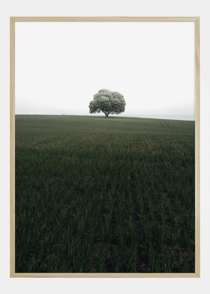 Αυτή η αφίσα παρουσιάζει μια μοναχική δρυ που υψώνεται από ένα καταπράσινο χωράφι, με μια απαλή ομίχλη που καλύπτει το τοπίο. Η μεγαλοπρεπής μορφή του δέντρου στέκεται σαν ένα φυσικό γλυπτό ενάντια στο απαλό φως, προσφέροντας μια ισχυρή οπτική αντίθεση με τα γραμμικά μοτίβα των καλλιεργειών στο προσκήνιο. Η συνολική πράσινη απόχρωση συμπληρώνεται με στοιχεία ζεστού καφέ και λεπτούς κόκκινους τόνους, προσθέτοντας βάθος και πολυπλοκότητα στην εικόνα.
