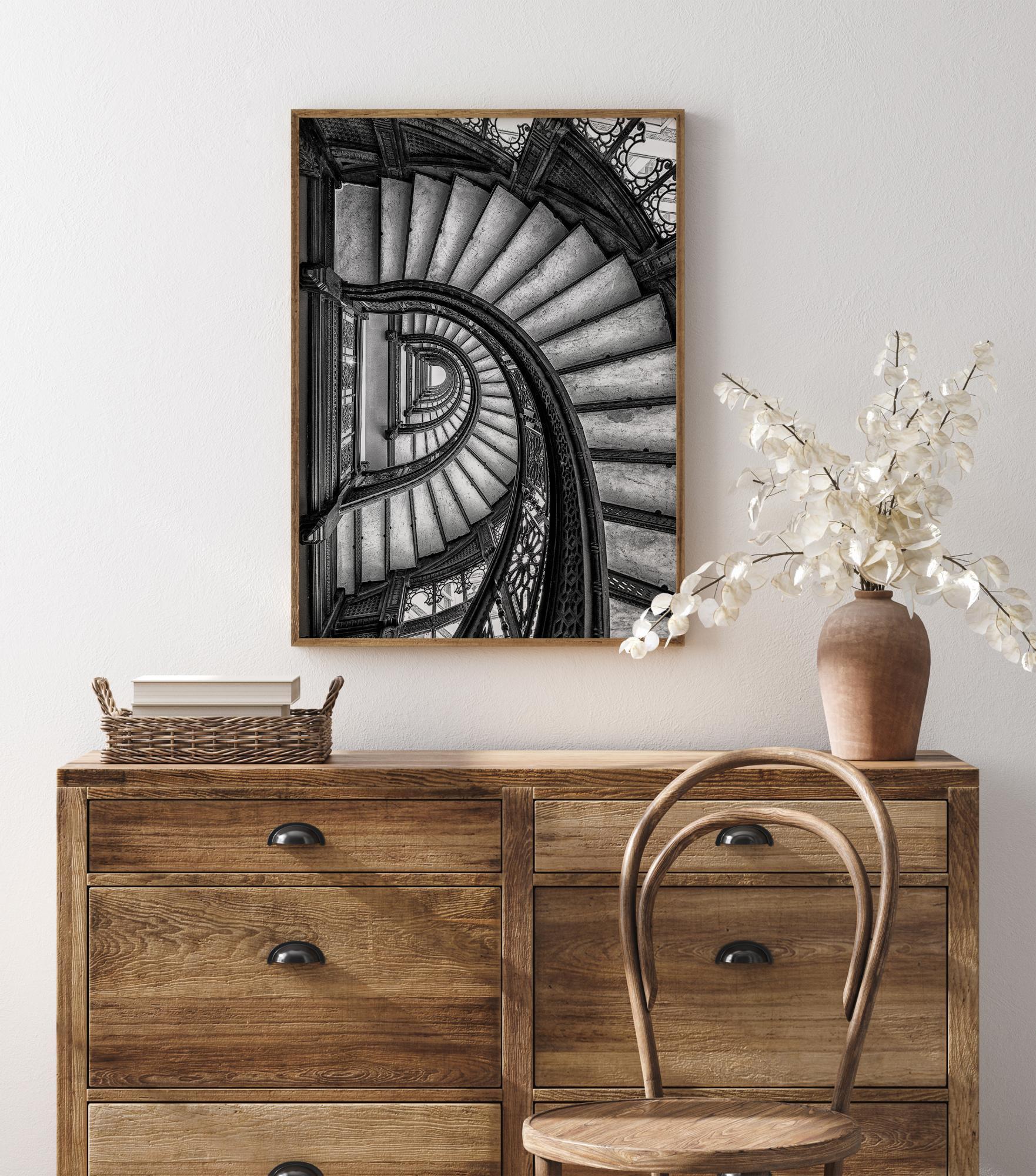 Μια αφίσα εσωτερικού χώρου με μια σειρά από ελικοειδείς σκάλες που κατεβαίνουν μέχρι τον πυθμένα του κτηρίου. Βλέποντας από πάνω, οι σκάλες περιστρέφονται γύρω. Οι χειρολισθήρες από σφυρήλατο σίδηρο είναι λεπτομερείς και ξεχωρίζουν σε σύγκριση με τα απλά σκαλοπάτια. Οι αντιθέσιμοι τόνοι δίνουν βάθος στο έργο καθώς το βλέμμα τραβάει μέχρι τον πυθμένα.