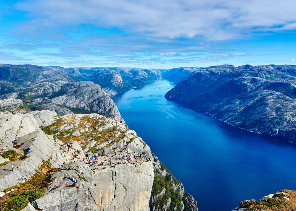 Φωτογραφία με μαγευτική θέα σε μια βαθιά κοιλάδα φιόρδ. Η αφίσα έχει τόνους βαθύ γαλάζιου της θάλασσας με ηλιόλουστους γυμνούς βράχους και στις δύο πλευρές του φιόρδ, ένα μεγαλειώδες τοπίο που ταιριάζει στον τοίχο του λάτρη της όμορφης φυσικής σκηνής. Συμπληρώστε την εικόνα με μια κορνίζα που αναδεικνύει το θέμα.