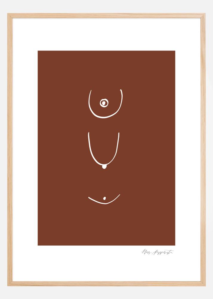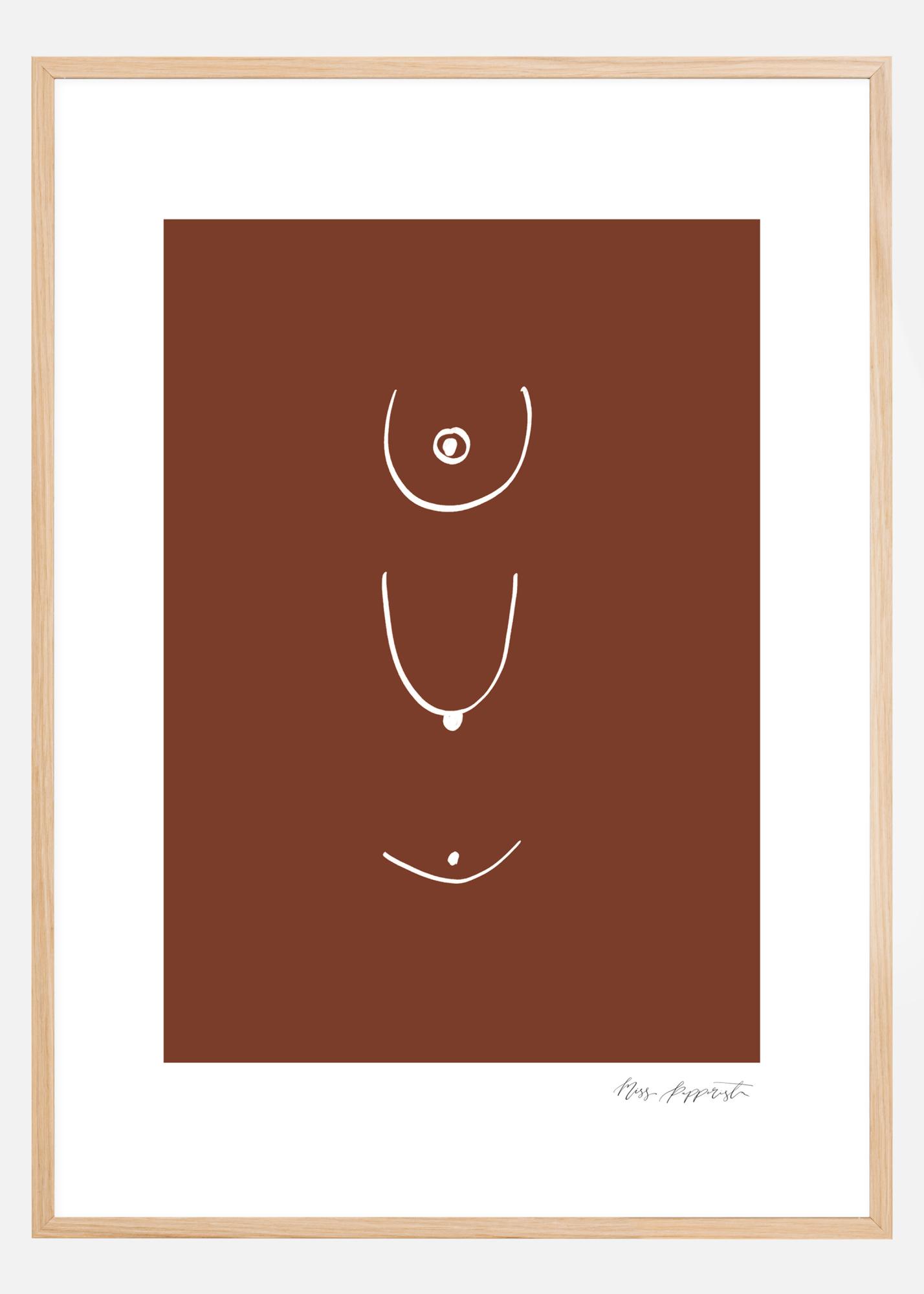 Μια αφηρημένη αφίσα με λευκές καμπύλες γραμμές και κουκκίδες σε ένα απλό καφέ φόντο. Οι γραμμές μπορούν να ερμηνευτούν όπως θέλεις, αλλά μοιάζουν με γυναικεία στήθη σχεδιασμένα από διαφορετικές γωνίες. Απόλαυσε τον ελαφρώς περίεργο χαρακτήρα αυτής της απλής εικόνας.