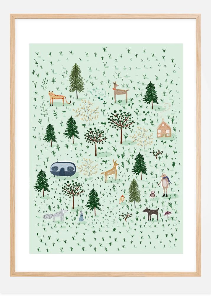 Μια ευχάριστη αφίσα με ένα μικρό δάσος, κυρίως γεμάτο με διάφορα ζώα. Αυτή είναι μια γραφική εικόνα με απλοποιημένα δέντρα, ζώα και σπίτια που είναι διάσπαρτα. Τίποτα δεν είναι σε κλίμακα. Υπάρχει μια μεγάλη όρθια αλεπού με κασκόλ και μπότες, ένα μικρό σπίτι και ένα τεράστιο τροχόσπιτο. Είναι κιτς, χαριτωμένο και θυμίζει χριστουγεννιάτικη κάρτα. Μια εξαιρετική αφίσα για κάθε δωμάτιο στο σπίτι.