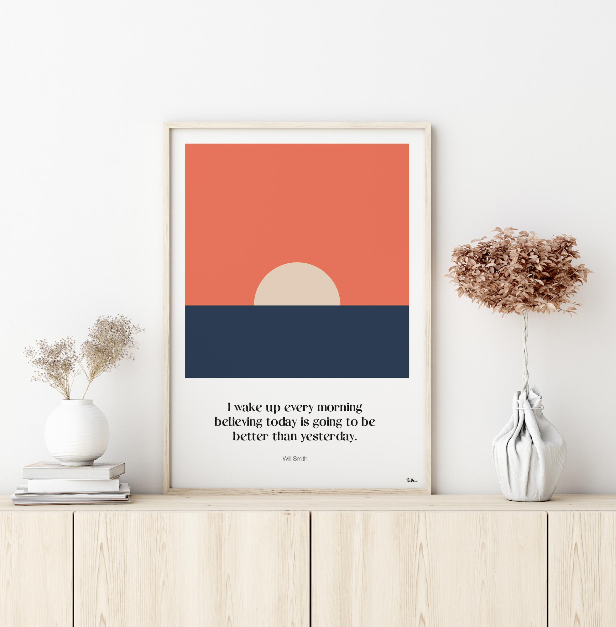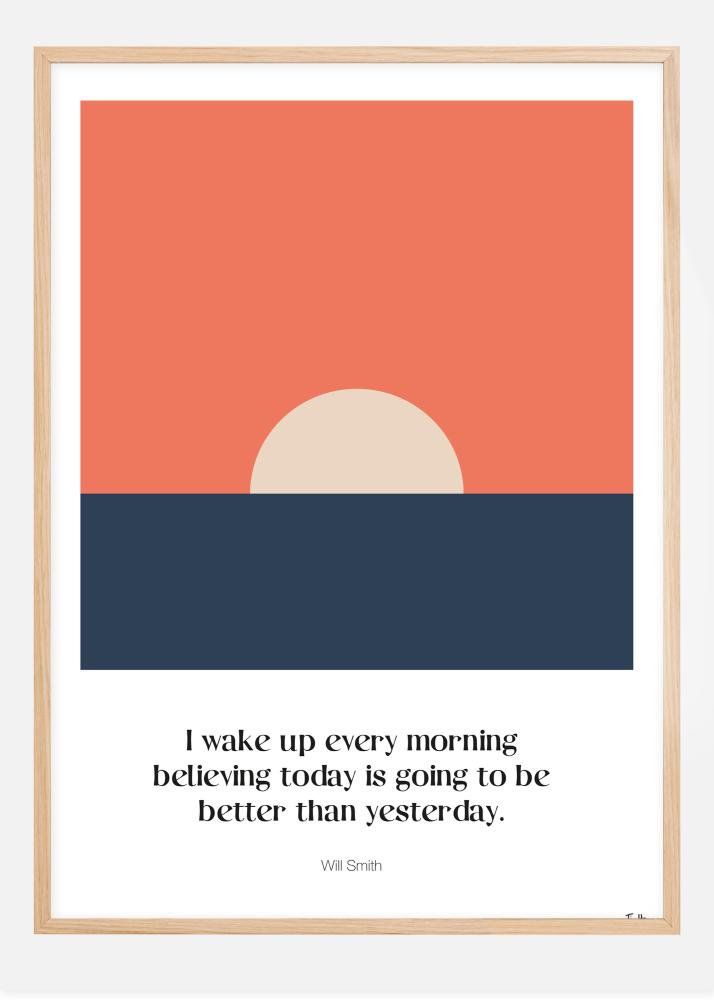 Μια αφίσα κειμένου με το απόφθεγμα του Will Smith "Ξυπνάω κάθε πρωί πιστεύοντας ότι η σημερινή μέρα θα είναι καλύτερη από τη χθεσινή" γραμμένο κάτω από μια γραφική απεικόνιση μιας ανατολής του ηλίου. Μια κομψή και λιτή αφίσα δημιουργημένη από τον Tim Hansson.