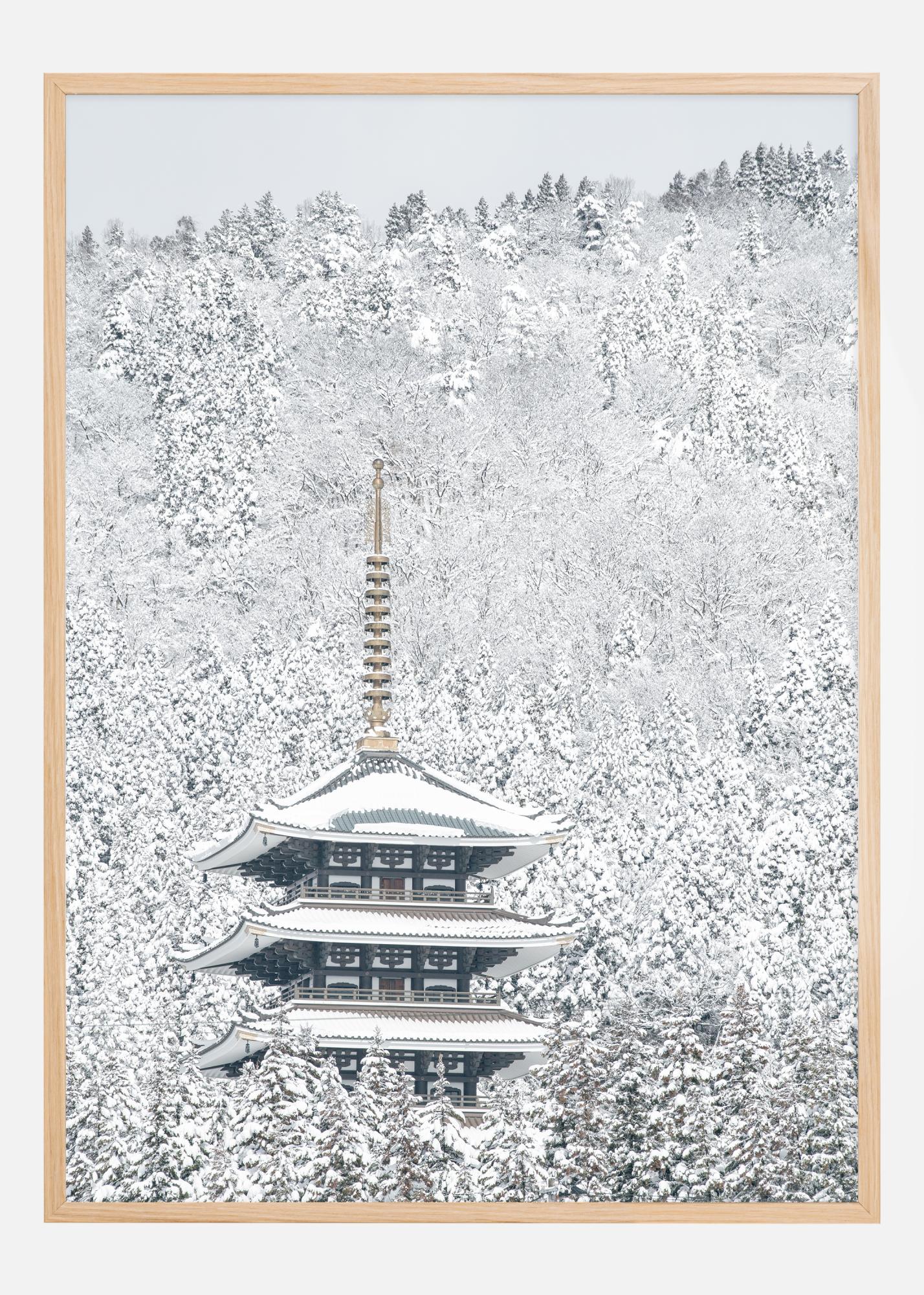Αυτή η ατμοσφαιρική αφίσα προκαλεί το γαλήνιο συναίσθημα ενός χειμωνιάτικα ντυμένου τοπίου, όπου ένα παραδοσιακό ανατολικοασιατικό κτίριο παγόδας στέκεται μεγαλοπρεπώς περιτριγυρισμένο από μια θάλασσα δέντρων φορτωμένων με χιόνι. Η διακριτική αντίθεση μεταξύ της λεπτομερούς αρχιτεκτονικής και των ισχυρών, πλούσιων δέντρων, όλα τυλιγμένα σε ένα παχύ στρώμα χιονιού, δημιουργεί μια εικόνα σιωπής και απομόνωσης. Αυτή η εκτύπωση αποτυπώνει τέλεια τη μοναχική ομορφιά της χειμερινής φύσης, όπου οι αποχρώσεις του λευκού ποικίλλουν από έντονο, λαμπερό φως μέχρι απαλούς, αμυδρούς τόνους.