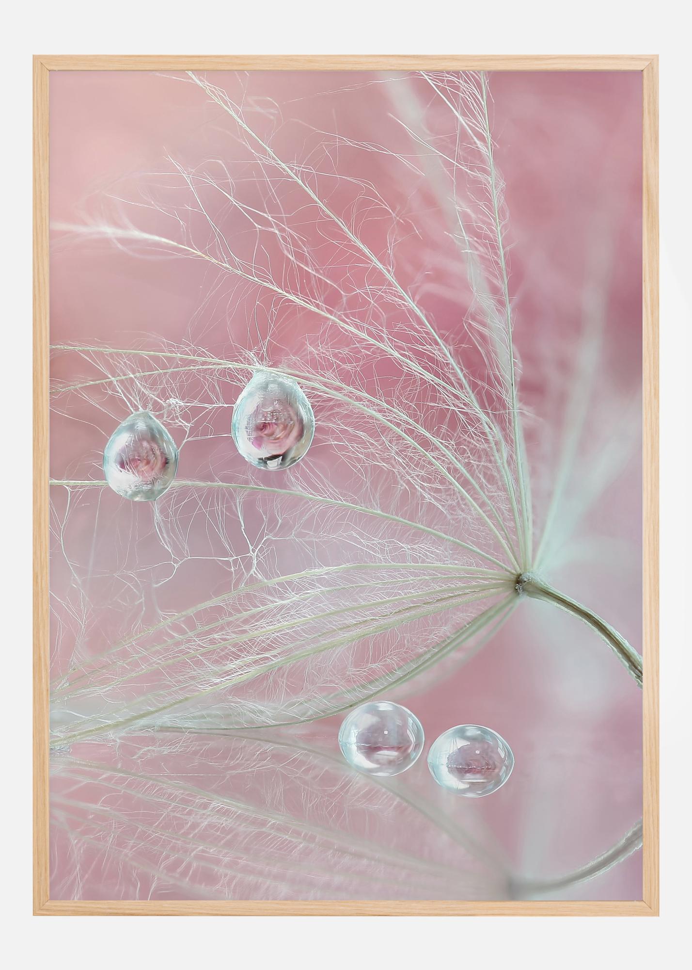 Μια κομψή αφίσα με ένα άνθος σε σχήμα αράχνης, με δύο σταγόνες νερού στις λεπτεπίλεπτες φτερωτές άκρες. Ένα ανοιχτό ροζ φόντο φωτίζει μέσα από καθεμία από τις τέλειες σταγόνες νερού καθώς κρέμονται ακριβώς πριν πέσουν από το άνθος. Απολαύστε την ευαίσθητη ισορροπία της φύσης.