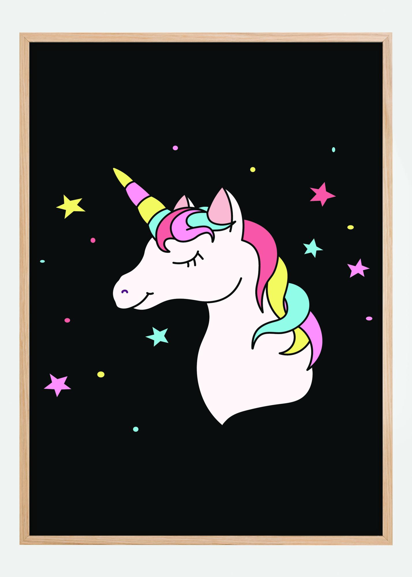 Μια χαριτωμένη αφίσα με μια παιδική λευκή μονόκερη σε μαύρο φόντο. Η μονόκερη έχει ρόδινη, κίτρινη και τυρκουάζ χαίτη και κέρατο. Αστέρια στις ίδιες αποχρώσεις γεμίζουν το μαύρο φόντο πίσω για να δημιουργήσουν μια διασκεδαστική ατμόσφαιρα άξια μιας πριγκίπισσας. Κρεμάστε την αυτή στο παιδικό δωμάτιο για να προσθέσετε μια διασκεδαστική, ασυνήθιστη εικόνα που ενθαρρύνει τη φαντασία των παιδιών.
