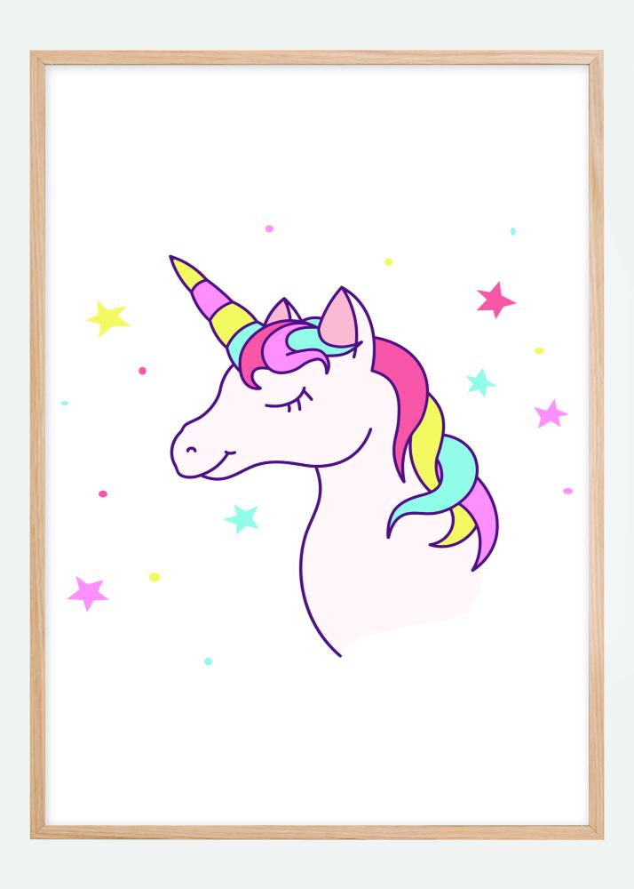 Μια έξυπνη αφίσα με έναν μονόκερο με κλειστά μάτια σε λευκό φόντο. Ο μονόκερος έχει κίτρινη, μπλε και ροζ χαίτη και κέρατο. Υπάρχουν επίσης αστέρια στις ίδιες αποχρώσεις που είναι διασκορπισμένα στο φόντο, δημιουργώντας μια γλυκιά μαγική εικόνα. Είναι τέλεια για ένα παιδικό δωμάτιο, καθώς είναι ένα απλό διασκεδαστικό σχέδιο.