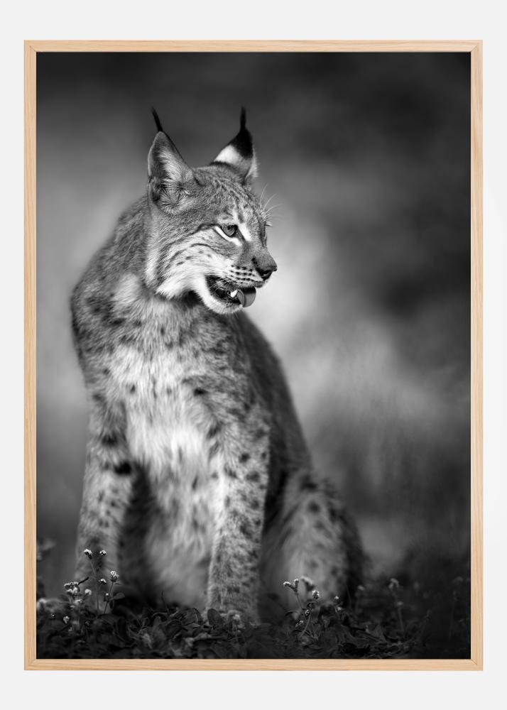 Μια αφίσα με άγρια ζωή με ένα λύγκα που κάθεται στο γρασίδι. Η γάτα κοιτάζει προς τα δεξιά στην εικόνα και ίσως βλέπει ένα πιθανό θήραμα. Οι φωτεινές κηλίδες στη γούνα και οι φουντίτσες στα αυτιά ξεχωρίζουν σε ευδιάκριτες λεπτομέρειες. Κρεμάστε αυτή την ασπρόμαυρη εκτύπωση σε έναν πράσινο τοίχο για μια φυσική αίσθηση.