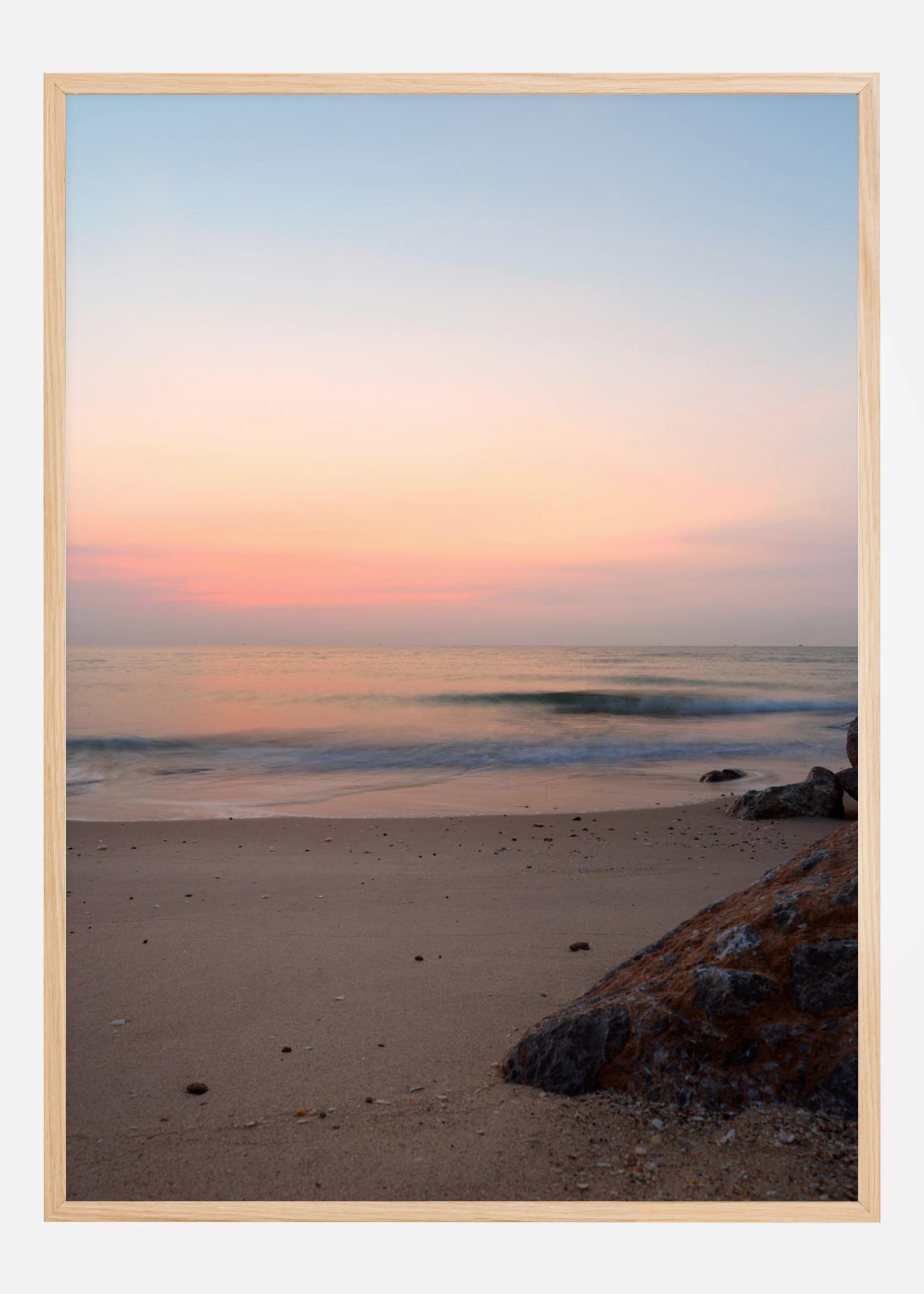 Μια αφίσα με μια πλατιά αμμουδιά και τη γαλήνια θάλασσα στο βάθος. Μια απαλή ανατολή του ήλιου εμφανίζεται στον ορίζοντα και ρίχνει ένα απαλό ροζ και μπλε φως πάνω από τη θάλασσα. Αποκτήστε αίσθηση διακοπών με αυτή την ήρεμη και γαλήνια παραθαλάσσια σκηνή.