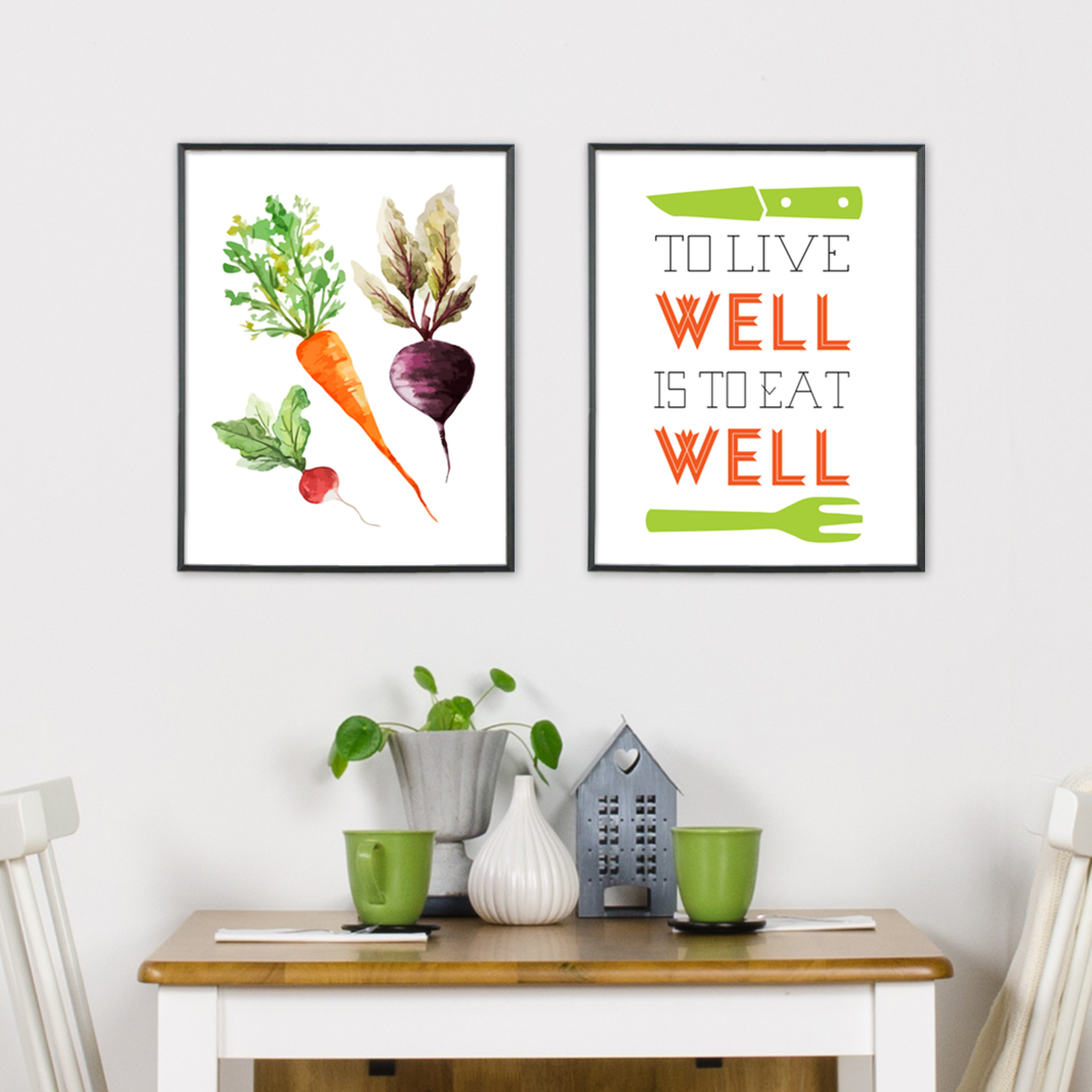 Γραφικό εκτύπωμα με μια όμορφη εικονογράφηση από ένα ραπανάκι, καρότο και παντζάρι. Η αφίσα είναι εξίσου κομψή για να κρεμαστεί στην κουζίνα όπως και σε έναν τοίχο τέχνης με θέμα τον κήπο στο καθιστικό, ή ίσως στο παιδικό δωμάτιο πάνω από την παιχνίδια κουζίνα. Το κομψό αίσθημα του εκτυπώματος καθιστά κατάλληλο να ενσωματωθεί σε όλα τα στυλ διακόσμησης, από την κουζίνα χώρα έως τη ρετρό διακόσμηση και σε ένα σκανδιναβικό ψυχρό στυλ. Συμπληρώστε με μια κορνίζα που ταιριάζει με τη διακόσμηση του δωματίου για να δημιουργήσετε μια αίσθηση ολοκλήρωσης στο περιβάλλον. Οι πίνακες κουζίνας συχνά είναι πολύ όμορφοι μαζί με ασημί κορνίζες που ταιριάζουν με το νεροχύτη, τις βρύσες και άλλες μεταλλικές λεπτομέρειες που συνήθως υπάρχουν σε μια κουζίνα.