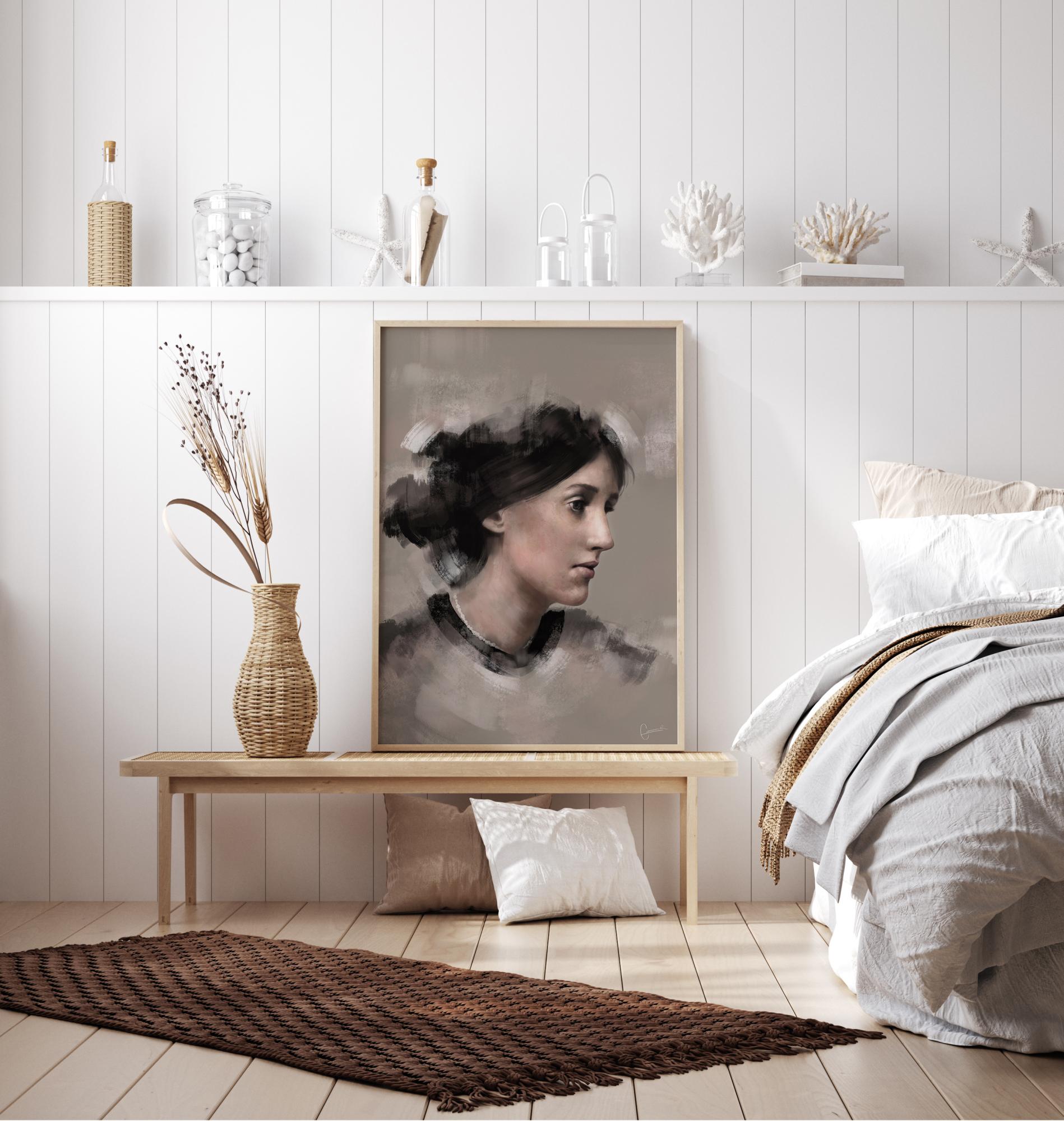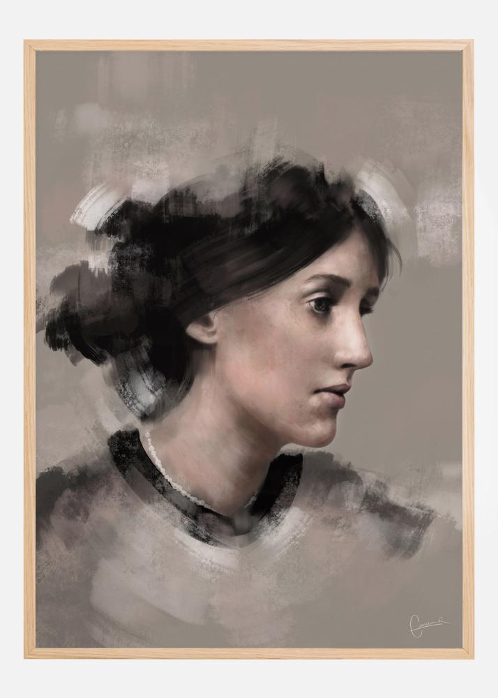 Μια αφίσα πορτρέτου με την Virginia Woolf σε προφίλ. Τα μαλλιά της είναι απλές απαλές πινελιές χρώματος, αλλά το πρόσωπό της αποδίδεται με λεπτομερή προσοχή. Το πορτρέτο είναι απαλό και θηλυκό και δίνει έναν σχεδόν μελαγχολικό τόνο στο πρόσωπό της καθώς κοιτάζει στο βάθος.