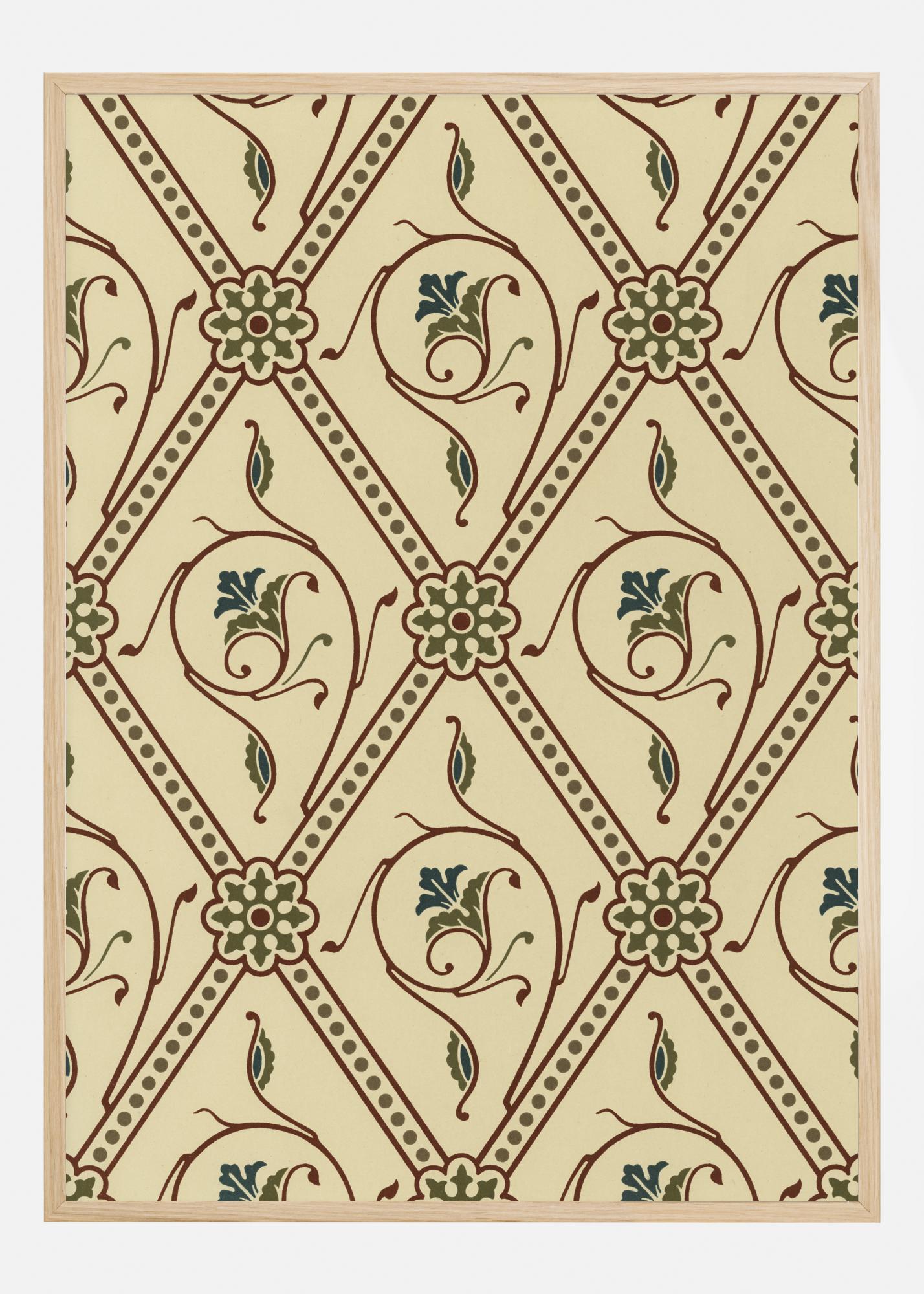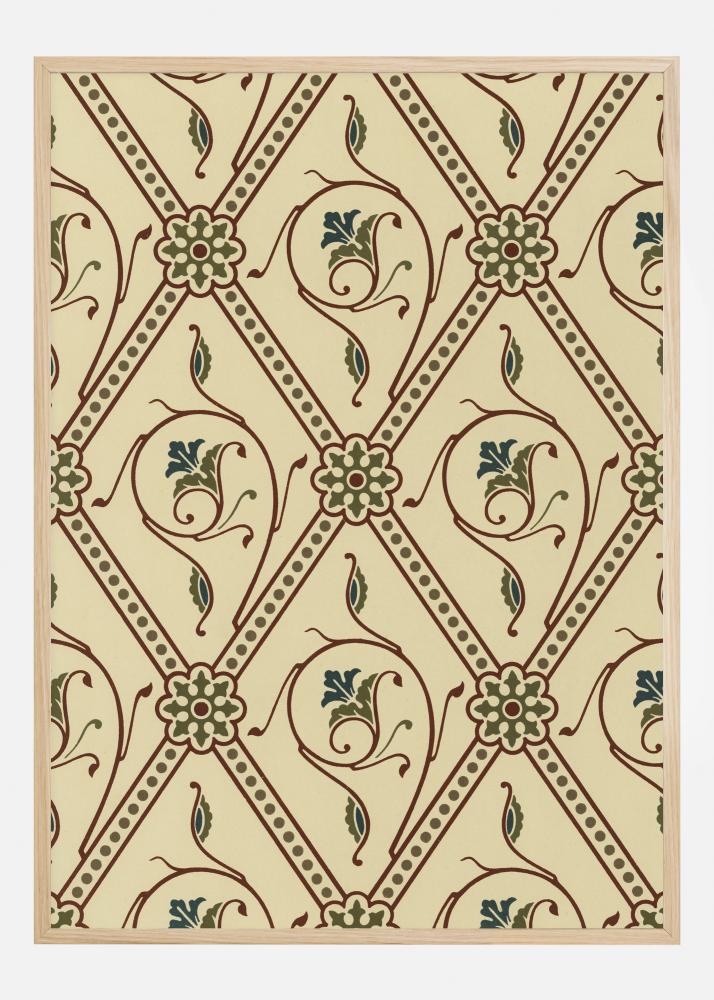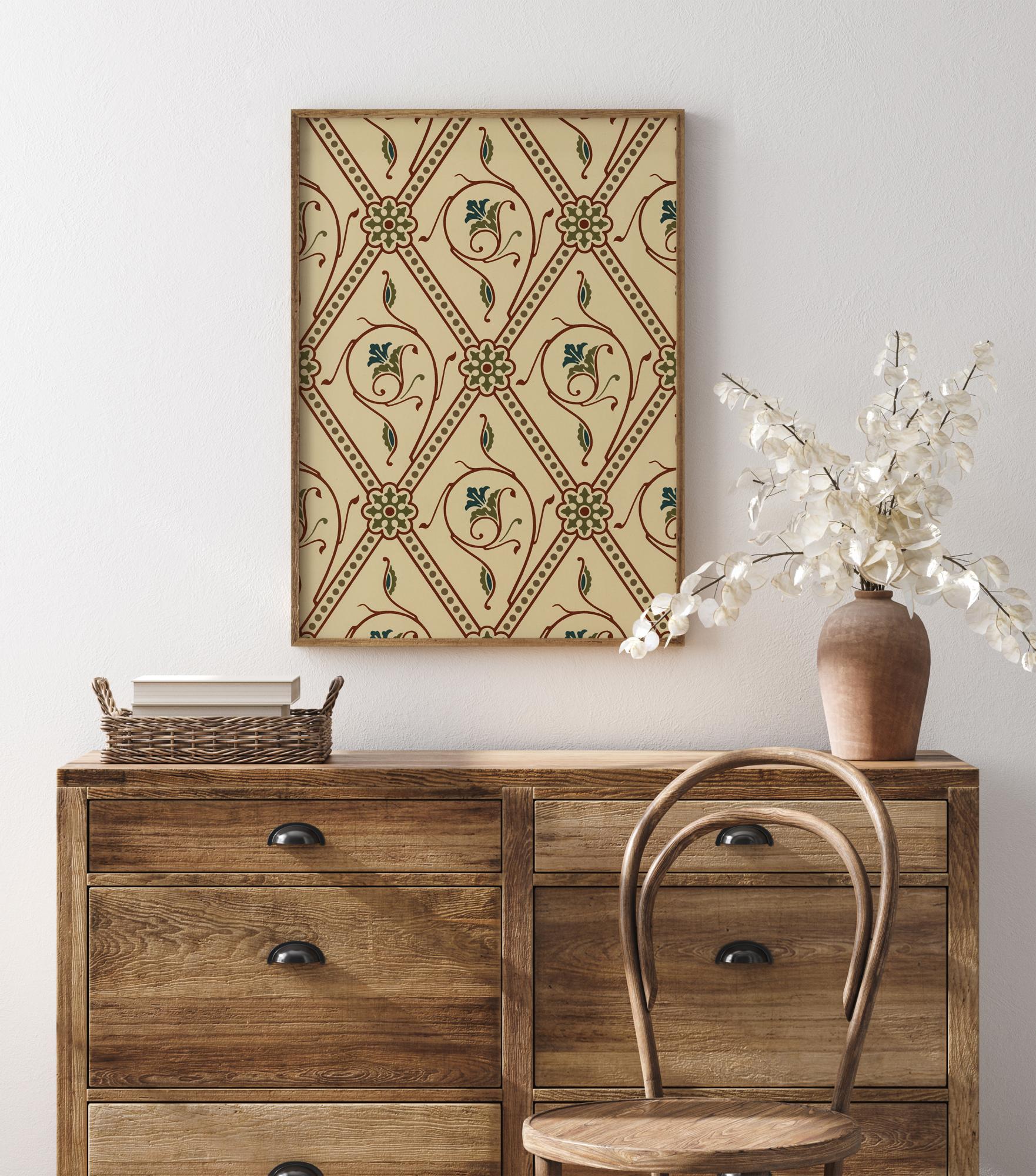 Μια αφίσα ταπετσαρίας με κρεμ, κόκκινα και πράσινα σχέδια. Μεγάλες διαμάντια σχηματίζουν τα κύρια όρια στο σχέδιο. Μέσα σε κάθε ένα από αυτά υπάρχει μια σειρά από καμπύλες κόκκινες γραμμές που καταλήγουν σε πράσινα και μπλε σχήματα φύλλων και λουλουδιών. Το σχέδιο είναι κομψό και ρέον, ο τέλειος τρόπος να διακοσμηθεί ένας λεία τοίχος με κάτι ελαφρώς διαφορετικό.