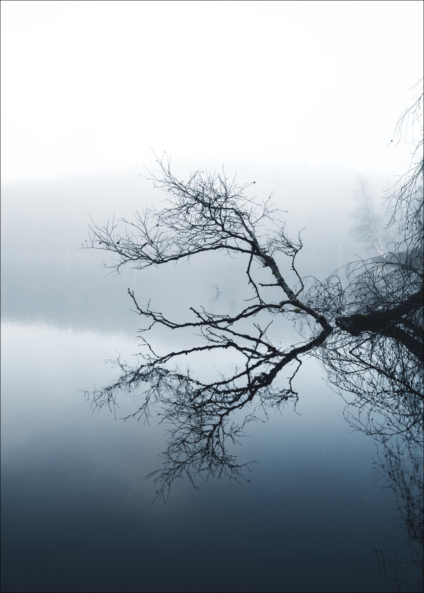 Μια λευκή αφίσα με μια ευρεία ήρεμη λίμνη με ένα νεκρό δέντρο που αναδύεται από το νερό. Καθώς το κλαδί καμπυλώνεται προς τα πάνω, ρίχνει την αντανάκλασή του στη λίμνη και δημιουργεί μια εκπληκτική αντανάκλαση. Ο λευκός ουρανός από πάνω βοηθά να ξεχωρίσει το πραγματικό κλαδί από την αντανάκλασή του. Οι μπλε τόνοι προσδίδουν μια πιο δροσερή αίσθηση σε έναν ζεστό τοίχο.