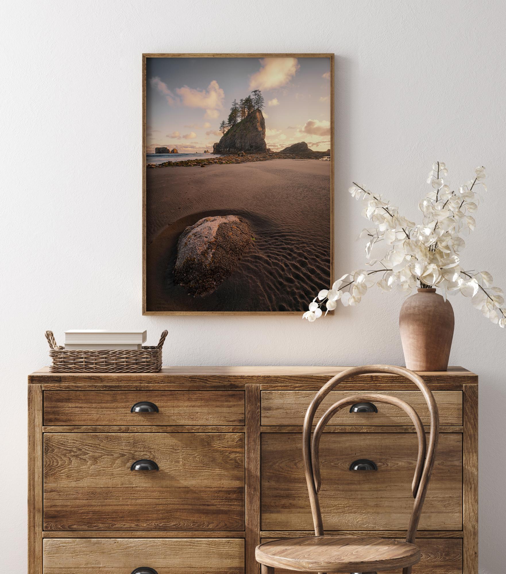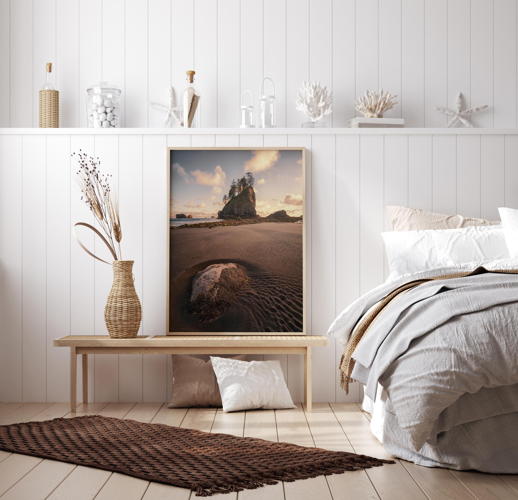 Μια γραφική αφίσα με κοντινό πλάνο της παραλίας. Η χαμηλή γωνία σε φέρνει κοντά στην άμμο όπου μπορείς να ακολουθήσεις τα ίχνη του νερού που έχουν δημιουργηθεί από μια συγκέντρωση νερού. Στο βάθος υψώνεται ένας δεντρόφυτος βράχος από τη θάλασσα προς έναν απαλό γαλάζιο ουρανό γεμάτο αφράτα λευκά σύννεφα.