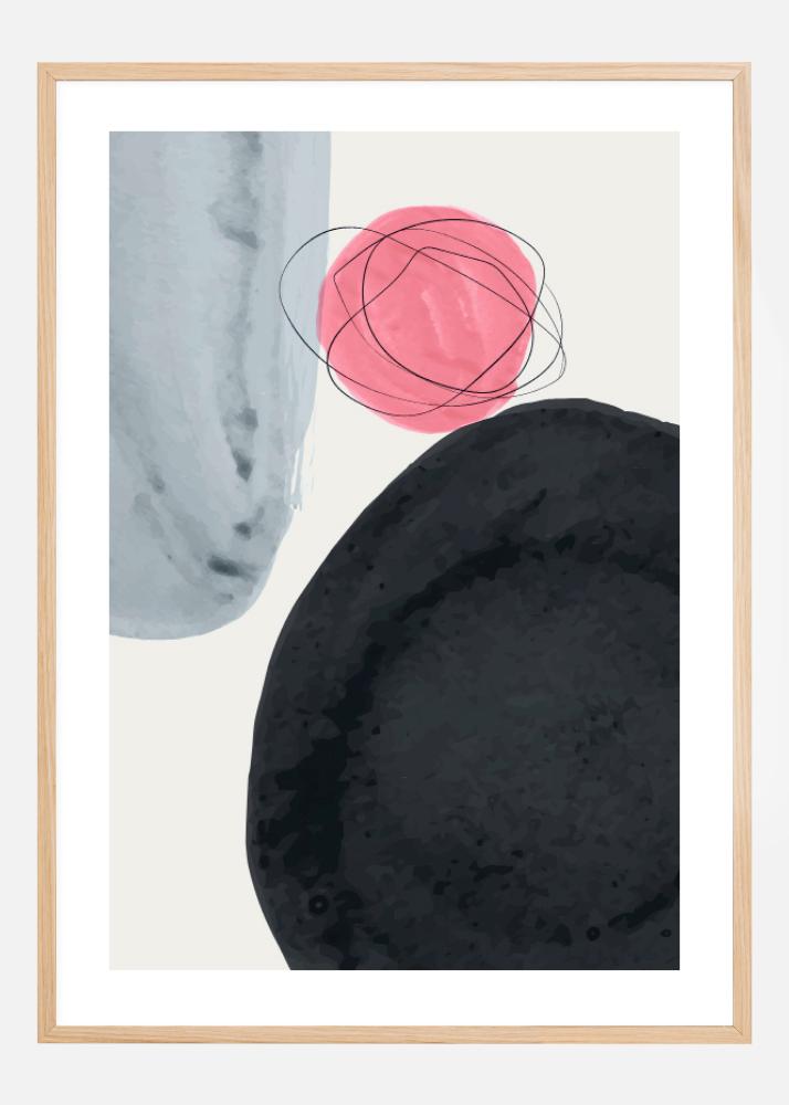 Μια ζωντανή αφηρημένη αφίσα με μεγάλες φόρμες που γεμίζουν ολόκληρη την εικόνα. Ένας μεγάλος μαύρος κύκλος γεμίζει την κάτω δεξιά γωνία. Από πάνω του υπάρχει ένας μικρός ροζ κύκλος με λεπτές μαύρες γραμμές που περιστρέφονται γύρω του για να δημιουργήσουν σπείρες. Μια τελευταία ανοιχτό γαλάζια μορφή κρέμεται από την επάνω αριστερή πλευρά.
