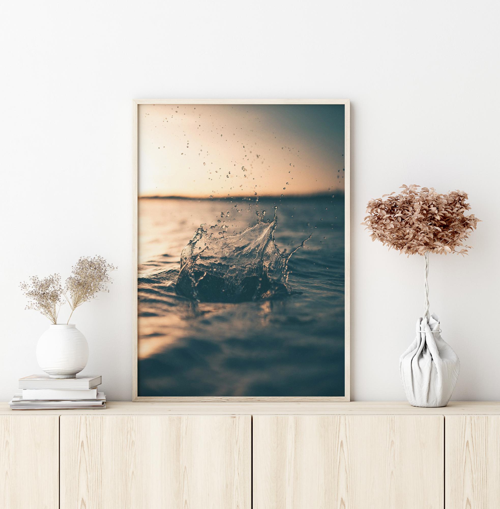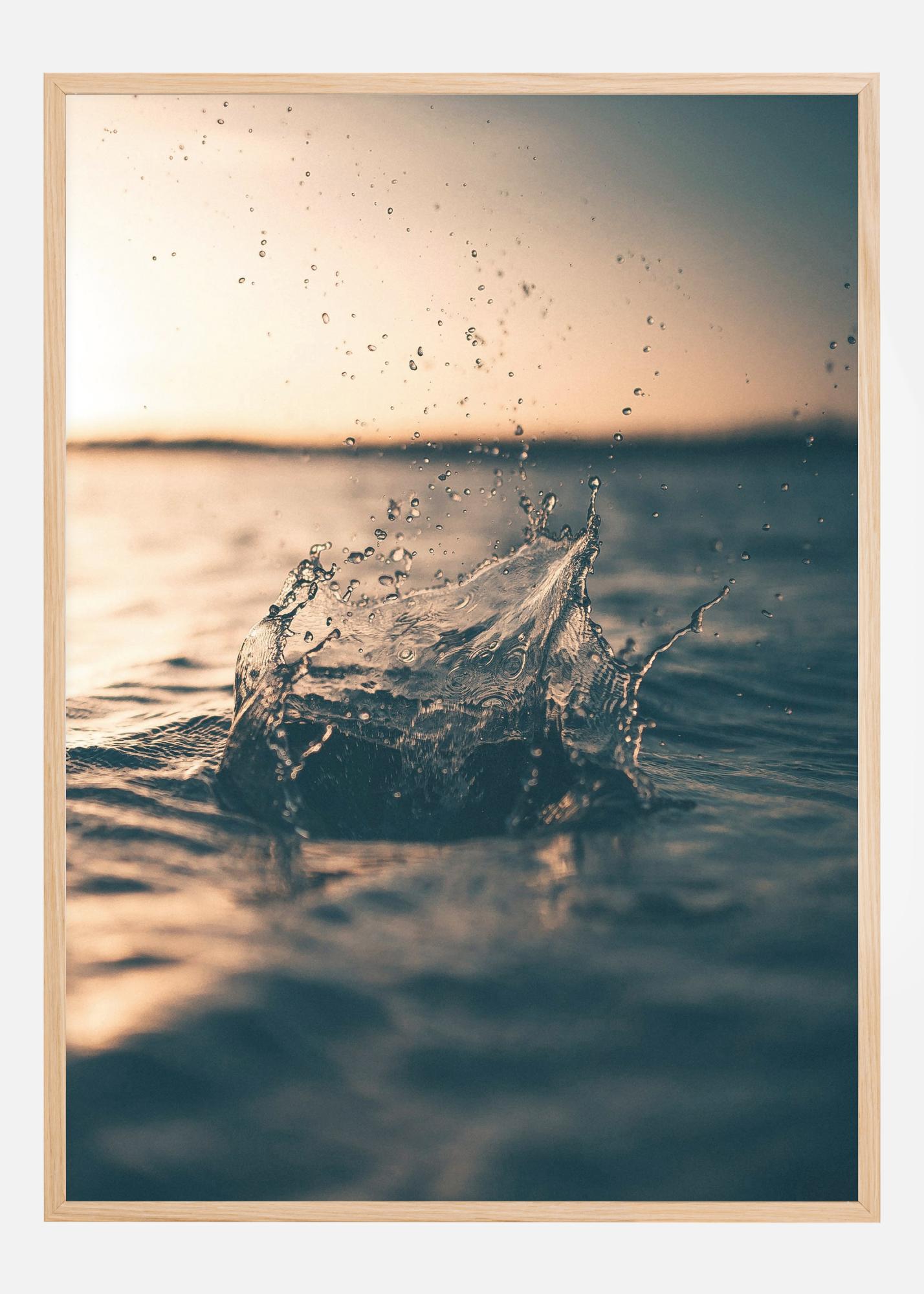 Μια αφίσα κοντινής λήψης των συνεπειών ενός αντικειμένου που πέφτει σε μια λακκούβα νερού. Οι άκρες του πιτσιλίσματος αναπηδούν δημιουργώντας μικρές σταγόνες στον αέρα. Ο ήλιος λάμπει από τα αριστερά φωτίζοντας τη σκηνή και συλλαμβάνει το πιτσίλισμα του νερού καθώς ανεβαίνει. Είναι μια συναρπαστική εικόνα.