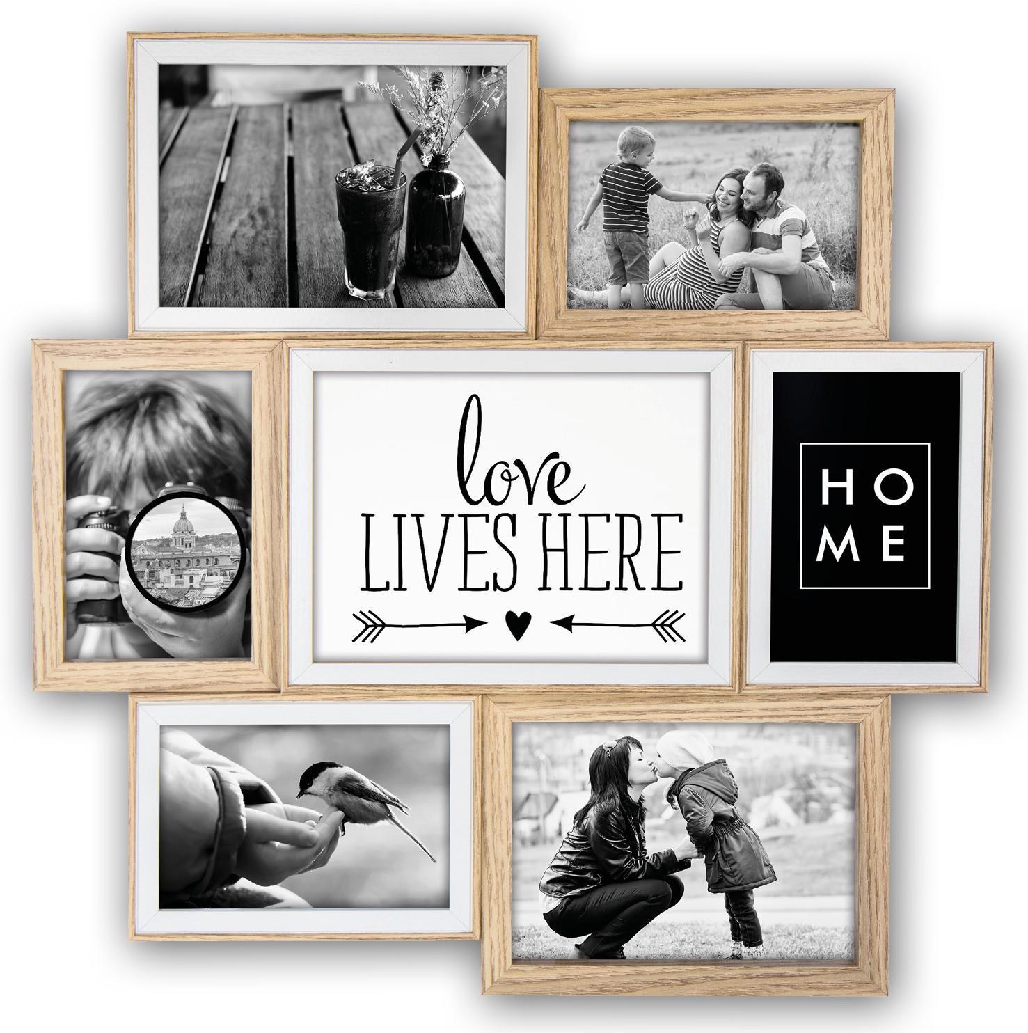 Κομψή κορνίζα κολάζ από ξύλο με χώρο για 7 εικόνες διαφορετικών μεγεθών.