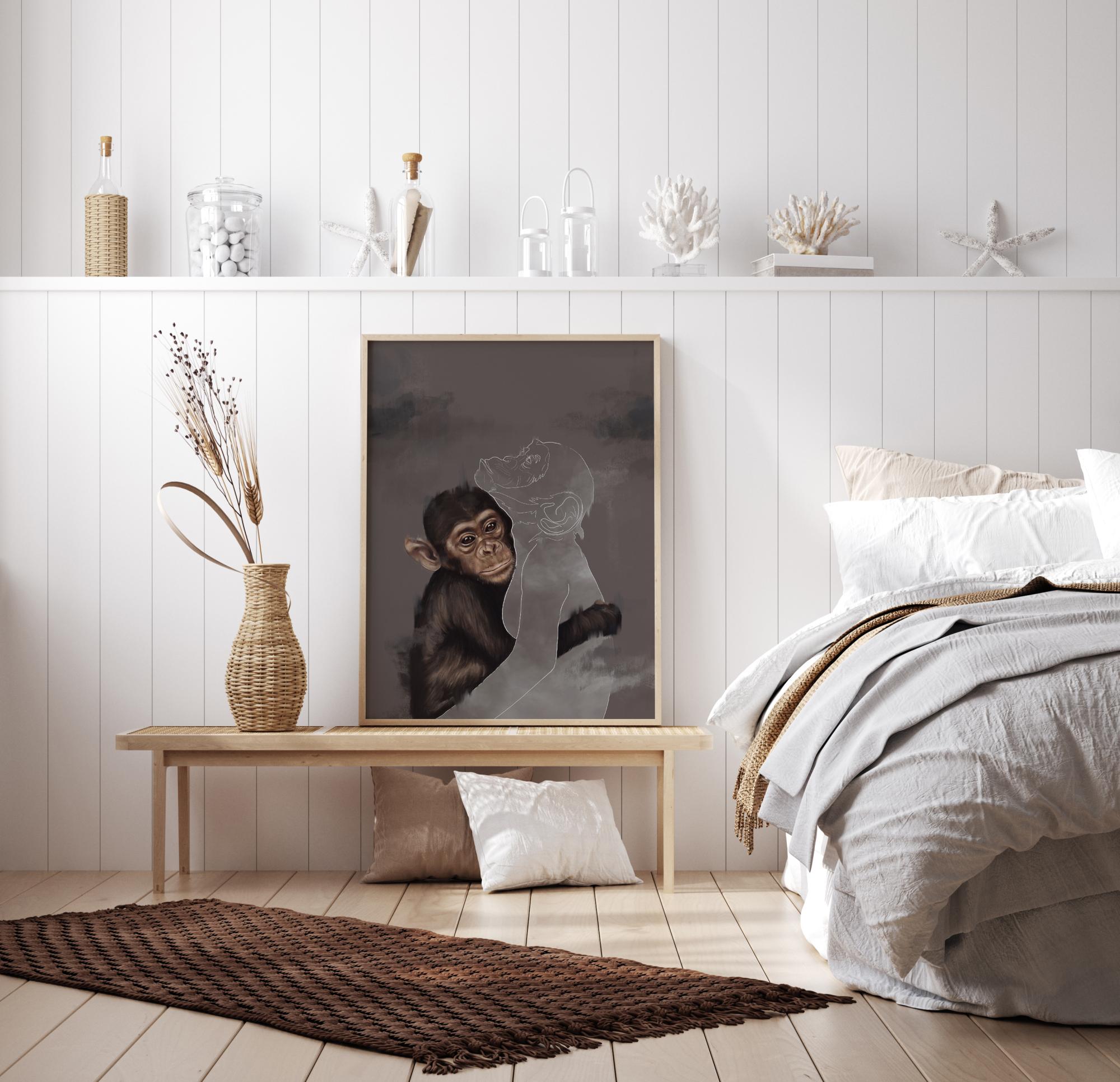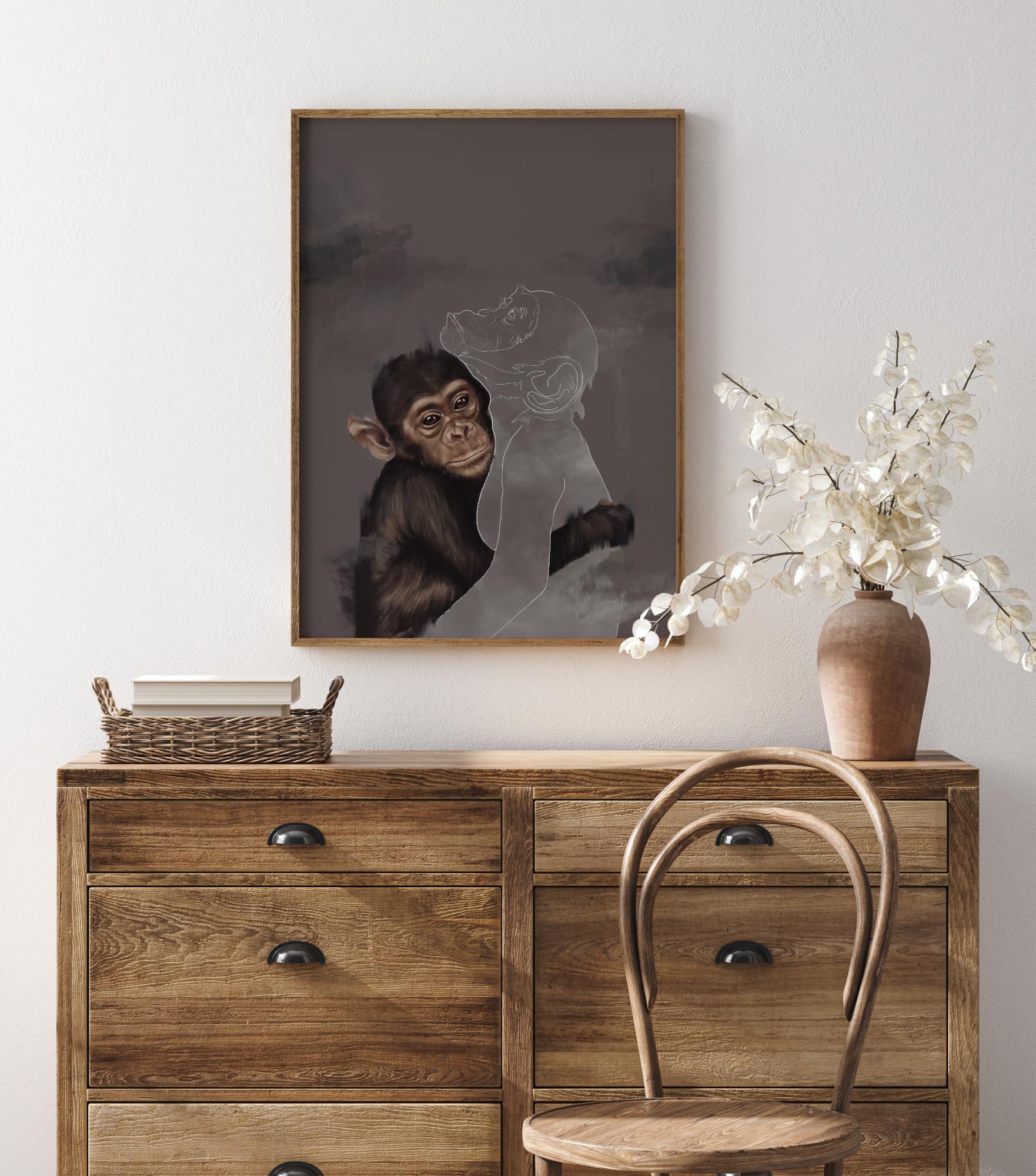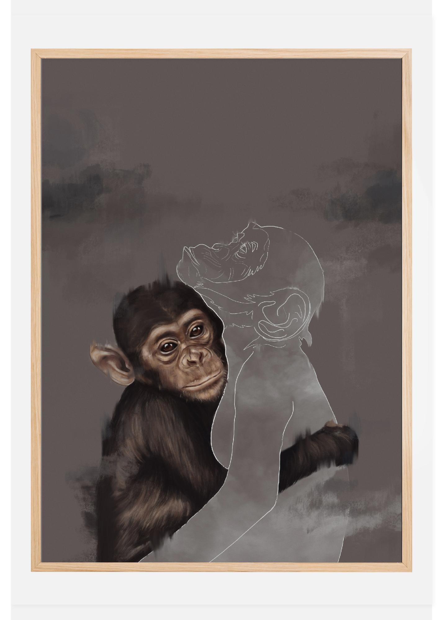 Μια φανταστική αφίσα σε μικτή τεχνική με έναν νεαρό χιμπαντζή που αγκαλιάζει έναν άλλον χιμπαντζή σε περίγραμμα. Αυτή η συναισθηματική εικόνα έχει μια λεπτομερή ζωγραφιά ενός χιμπαντζή που περιβάλλει με το χέρι του το λευκό περίγραμμα ενός άλλου χιμπαντζή. Ο άλλος λείπει, οπότε πού βρίσκεται ο άλλος πίθηκος και γιατί δεν είναι πια εκεί;