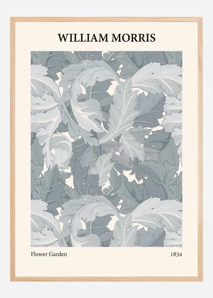 Αυτή η αφίσα με το πλούσιο και εκλεπτυσμένο μοτίβο του William Morris προσφέρει μια αίσθηση ηρεμίας και κλασικής κομψότητας. Ο σχεδιασμός αποτελεί ωδή στην άφθονη βλάστηση που συχνά συνδέεται με τον Morris και το έργο του στο κίνημα Arts and Crafts. Το μοτίβο, με τίτλο "Flower Garden", περιέχει μια πυκνή σύνθεση φύλλων και ανθοφορίας, αποτυπωμένη σε ψυχρούς τόνους μπλε και γκρι με πινελιές κρεμ χρώματος. Κάθε λεπτομέρεια σε αυτή την αφίσα είναι προσεκτικά μελετημένη, δημιουργώντας μια αίσθηση ενάρετου και τακτοποιημένου κήπου.