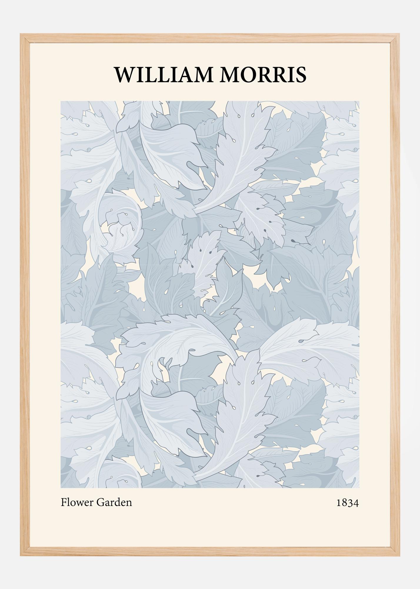 Με μια ατμόσφαιρα ηρεμίας και κομψότητας, αυτή η αφίσα του William Morris παρουσιάζει μια συμφωνία περίτεχνων φυλλωμάτων σε μια ψυχρή και καταπραϋντική χρωματική παλέτα. "Flower Garden", όπως υποδηλώνει ο τίτλος, αιχμαλωτίζει την ουσία ενός πλούσιου και ήσυχου κήπου μέσα από το λεπτομερές μοτίβο φυλλώματος που ρέει πάνω στην επιφάνεια με έναν απαλό ρυθμό. Η χρωματική παλέτα έχει επιλεγεί προσεκτικά για να αντικατοπτρίζει την υποτονική ομορφιά της φύσης και περιλαμβάνει γαλάζιο του ουρανού, πράσινο των φύλλων και απαλές κρεμ αποχρώσεις, που μαζί δημιουργούν μια αρμονική και ισορροπημένη αισθητική.