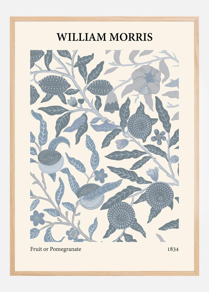 Αυτή η λεπτομερής και κομψή αφίσα παρουσιάζει την εικονική σχεδίαση "Fruit or Pomegranate" του William Morris, που εδώ απεικονίζεται με μια αναζωογονητική και κομψή χρωματική παλέτα. Η εκλεπτυσμένη διάταξη των ροδιών αναμεμειγμένη με διάφορες μορφές φύλλων και λουλούδια δίνει μια αίσθηση ζωντανής και ακμάζουσας φύσης. Η διακριτική χρωματική παλέτα της αφίσας, με αποχρώσεις του μπλε και του γκρι σε μια κρεμώδη βάση, προσφέρει μια εκλεπτυσμένη και σύγχρονη εντύπωση που ταιριάζει απόλυτα σε μια ποικιλία εσωτερικών στυλ διακόσμησης.