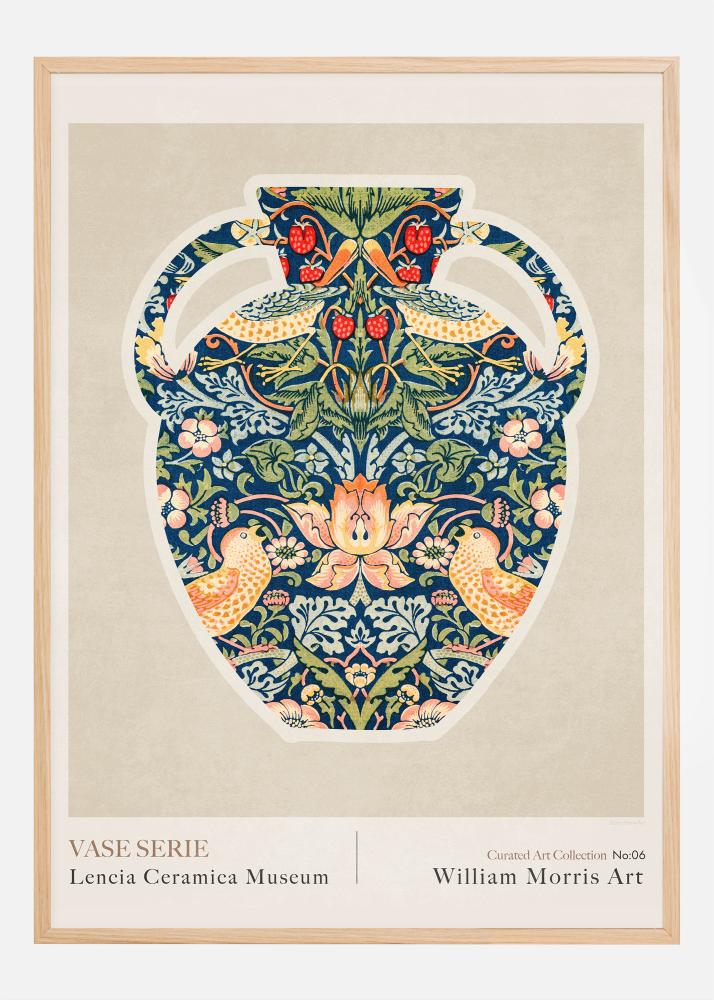 Αφίσα αριθμός 06 στη "Curated Art Collection" μας στο Μουσείο Lencia Ceramica είναι ένας άφθονος φόρος τιμής στα χειροτεχνήματα του William Morris. Απεικονίζει ένα βάζο διακοσμημένο με ένα συμμετρικό και λεπτομερές μοτίβο, ζωηρό με παραστάσεις πουλιών και λουλουδιών που είναι εμβληματικά για τη φιλοσοφία σχεδίασης του Morris. Κάθε στοιχείο σε αυτό το μοτίβο είναι μελετημένο για να τιμήσει την ομορφιά της φύσης και τη δυνατότητα της τέχνης να την μιμείται.