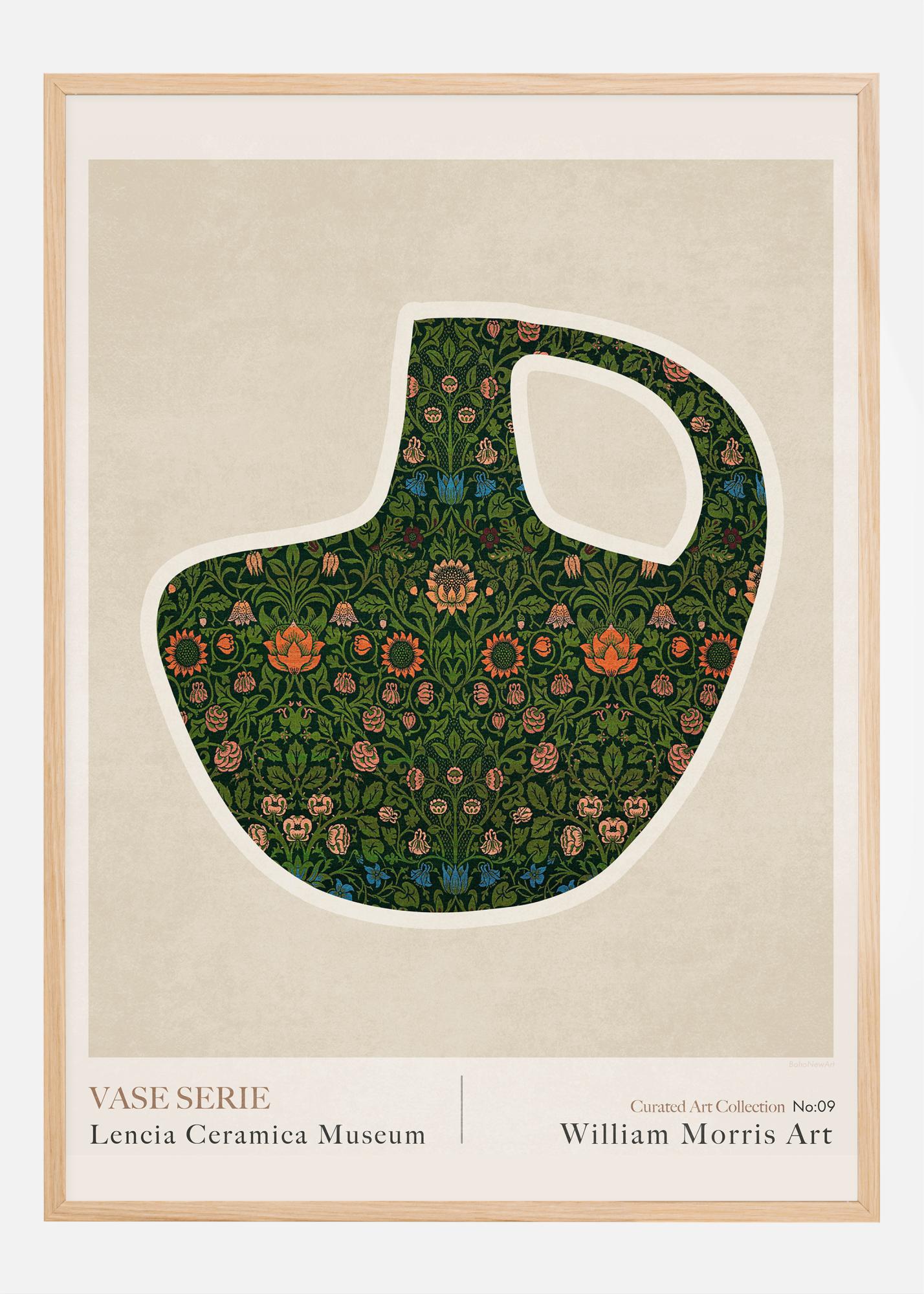 Η χρωματική παλέτα της αφίσας είναι βαθιά και ζεστή, με αποχρώσεις του πράσινου, πορτοκαλί και ροζ που δημιουργούν μια πλούσια και πολύπλοκη παλέτα. Αυτή η εκλεπτυσμένη χρωματική σύνθεση διακρίνεται όμορφα στη φόντο της ουδέτερης απόχρωσης και προβάλλεται μέσα σε ένα απλό και καθαρό ξύλινο πλαίσιο (δεν περιλαμβάνεται στη σύνθεση). Ως νούμερο 09 στη σειρά βάζων του Μουσείου Λένσια Κεραμικά, αυτή η αφίσα αποτελεί έναν φόρο τιμής στην καλλιτεχνική δημιουργία του Γουίλιαμ Μόρις και προσφέρει μια κομψή και ιστορικά συνδεδεμένη διακόσμηση για όλους όσοι εκτιμούν το μεγαλείο του σχεδιασμού και την ομορφιά των μοτίβων της φύσης.