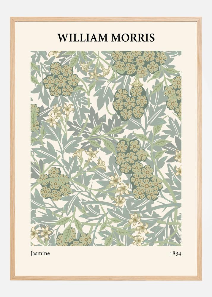 Η αφίσα "Jasmine" του William Morris είναι μια επίδειξη τόσο του λεπτού όσο και του δυναμικού στη φύση της χλωρίδας. Αυτή η εκτύπωση είναι ζωντανή με το ρέον μοτίβο της από άνθη γιασεμιού και πλούσια φυλλώματα. Το μοτίβο είναι συντεθειμένο με μια εκλεπτυσμένη παλέτα χρωμάτων σε πράσινο, μπεζ και κίτρινο, που συνδυάζονται για να δημιουργήσουν την αίσθηση ενός πυκνού και φιλόξενου κήπου, έτοιμου να εξερευνηθεί και να θαυμαστεί.