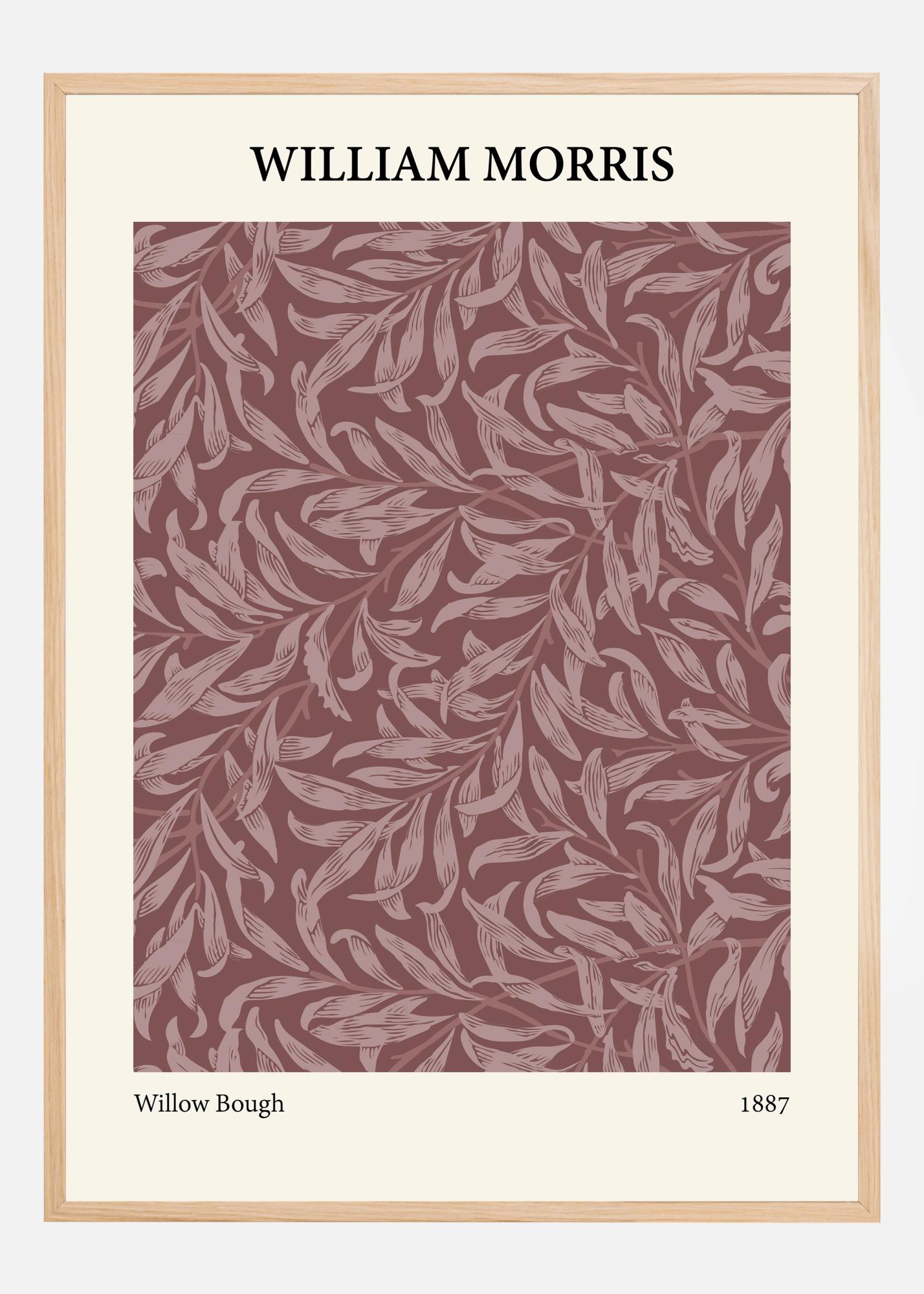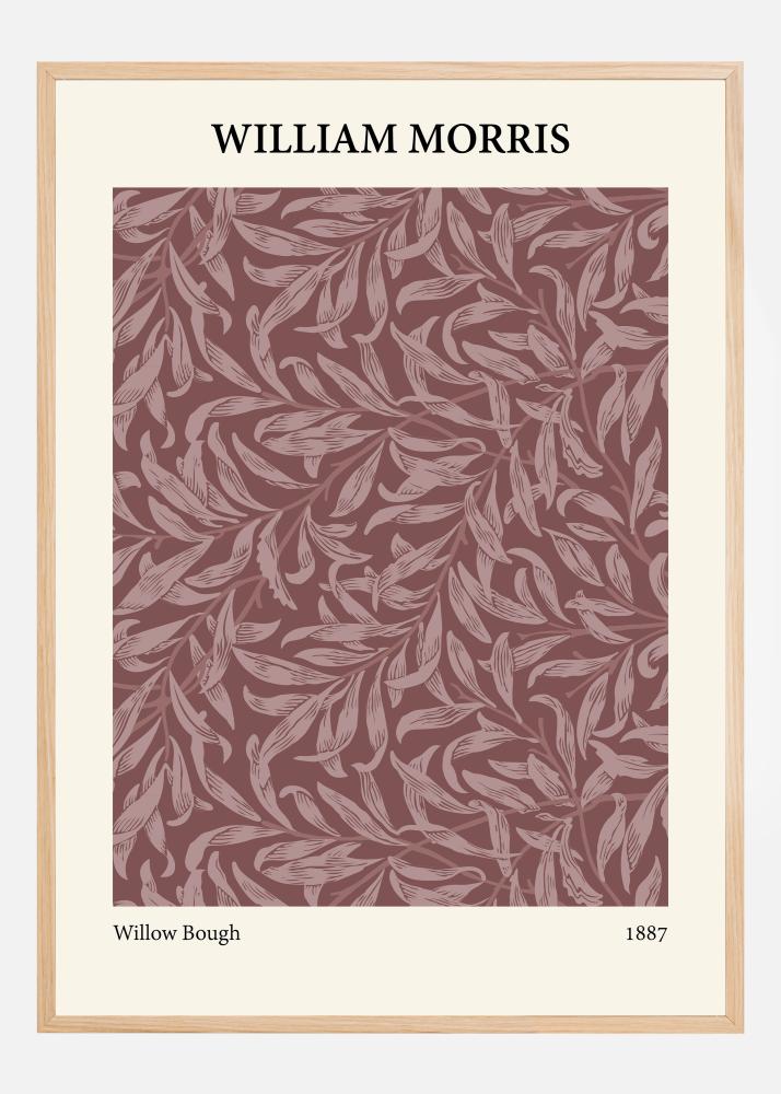 Αυτή η διακριτική αφίσα αναδεικνύει την ομορφιά του "Willow Bough" του William Morris από το 1887, που εδώ παρουσιάζεται σε ζεστούς και πλούσιους κοκκινωπούς τόνους που θυμίζουν φθινοπωρινά φύλλα ή κανέλα. Τα χορευτικά φύλλα ιτιάς μπροστά από το βαθύ φόντο δίνουν μια αίσθηση κίνησης και βάθους, καθιστώντας αυτό ένα από τα πιο εντυπωσιακά σχέδια του Morris.