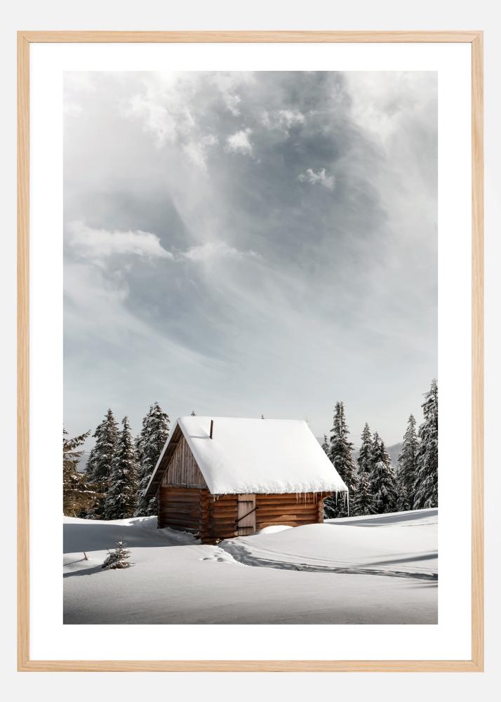 Μια αφίσα Χριστουγέννων με ένα μικρό ξύλινο εξοχικό σπίτι σε ένα χιονισμένο τοπίο. Απαλός χιόνι καλύπτει το έδαφος και τη στέγη του σπιτιού σε αυτή τη χειμωνιάτικη εικόνα. Έλατα είναι καλυμμένα με χιόνι και σκοτεινά γκρίζα σύννεφα χιονιού γεμίζουν τον ουρανό έτοιμα να φέρουν περισσότερο χιόνι. Νιώστε το χειμερινό κρύο σε αυτή την κομψή εκτύπωση.