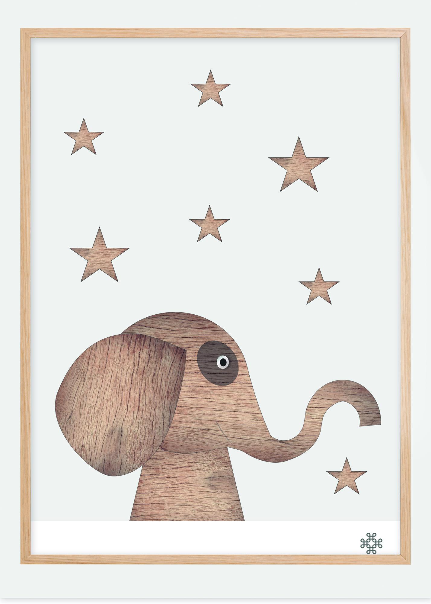 Μια αφίσα με σχεδίαση ξύλου με ένα χαριτωμένο ελέφαντα περιτριγυρισμένο από αστέρια. Ο ελέφαντας είναι κατασκευασμένος από ένα κολάζ με μοτίβο ξύλου που του προσδίδει μια δομική επίδραση. Τα αστέρια είναι τοποθετημένα τριγύρω για να δημιουργήσουν αυτή τη ευφάνταστη εικόνα που θα είναι ένα θετικό και χαρούμενο συμπλήρωμα για οποιοδήποτε παιδικό δωμάτιο.