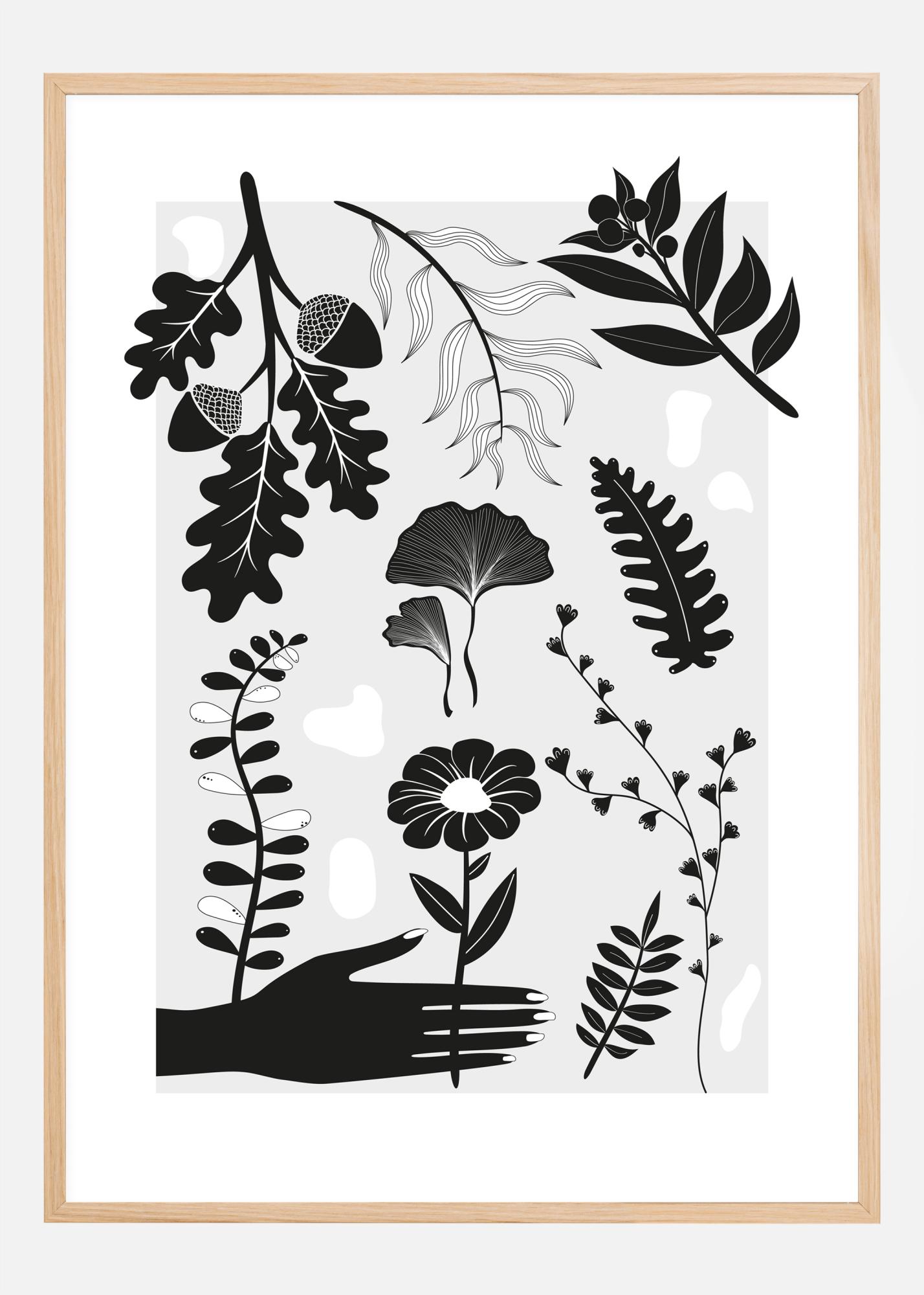 Μια τολμηρή αφίσα με ασπρόμαυρες φιγούρες από διάφορα φύλλα, φυτά και λουλούδια. Ένα μαύρο χέρι εκτείνεται για να πιάσει ένα από τα στιλιζαρισμένα λουλούδια. Βελανίδια, λουλούδια, φτέρες και άλλα γεμίζουν αυτό το απλό αλλά ενδιαφέρον τύπωμα. Βάλτε τον εαυτό σας σε βοτανική διάθεση όταν κρεμάτε αυτήν την αφίσα φυτών στο σπίτι σας.