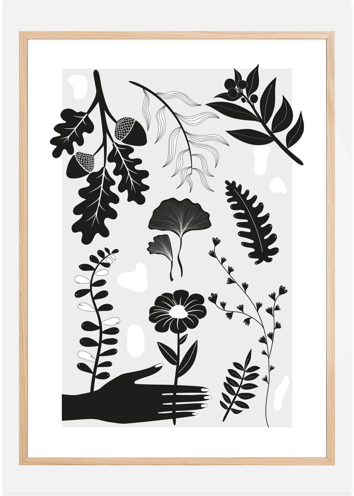 Μια τολμηρή αφίσα με ασπρόμαυρες φιγούρες από διάφορα φύλλα, φυτά και λουλούδια. Ένα μαύρο χέρι απλώνεται για να πιάσει ένα από τα στιλιζαρισμένα λουλούδια. Βελανίδια, λουλούδια, φτέρες και άλλα γεμίζουν αυτό το απλό αλλά ενδιαφέρον εκτύπωμα. Βάλτε τον εαυτό σας σε βοτανική διάθεση όταν κρεμάσετε αυτήν την αφίσα φυτών στο σπίτι σας.