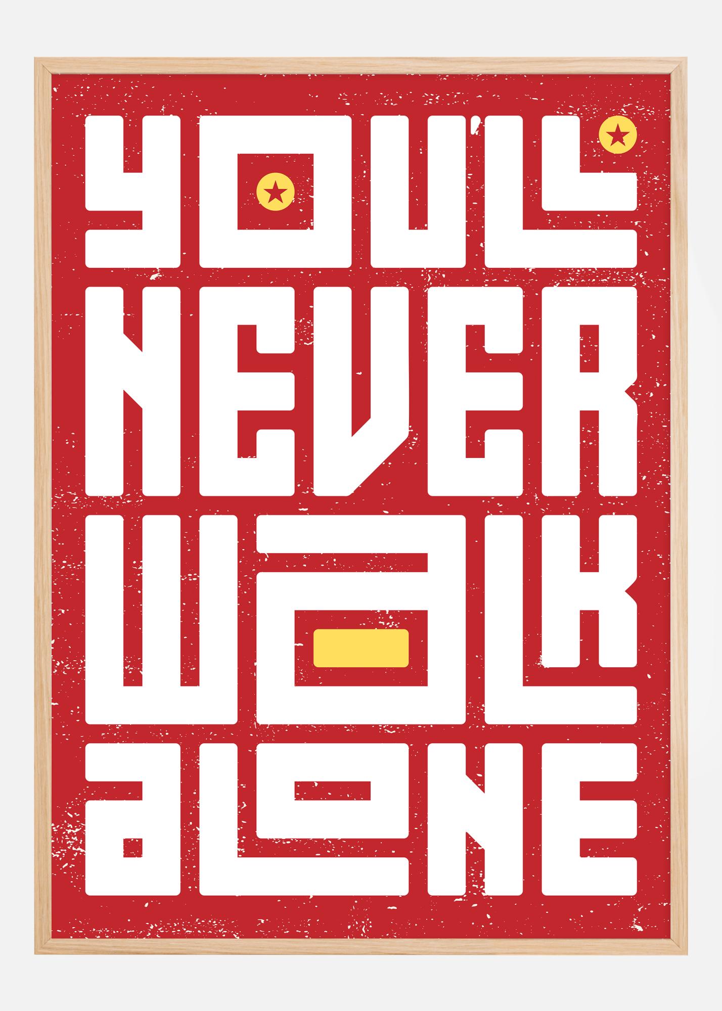 Αυτή η ενεργητική και ανεβαστική αφίσα εκπέμπει μια ισχυρή παρουσία με την τολμηρή, μπλοκ τυπογραφία της, που τονίζει το μήνυμα "You'll Never Walk Alone" με λαμπερά λευκά γράμματα σε ένα ισχυρό κόκκινο φόντο. Τα μεγάλα γράμματα είναι προσεκτικά τοποθετημένα για να μεγιστοποιήσουν την οπτική τους επίδραση και είναι διακοσμημένα με χρυσά αστέρια και ορθογώνιο σχήμα που διακόπτει το μπλοκ κειμένου, προσδίδοντας μια επιπλέον διάσταση στο σχέδιο.