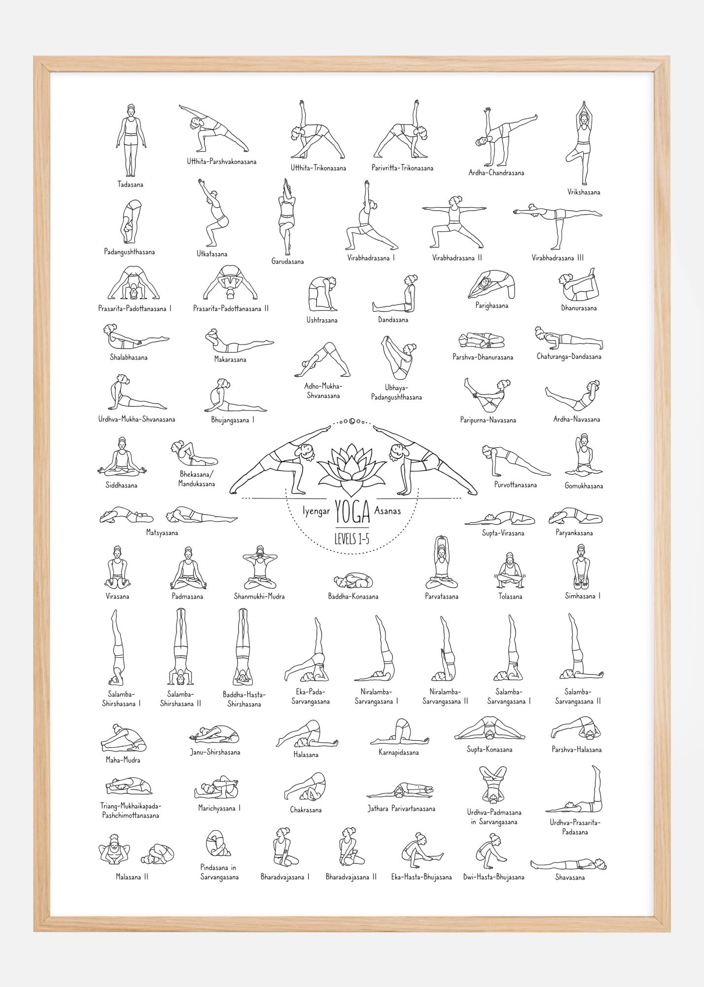 Αυτή η αφίσα με λεπτομερή και εκπαιδευτική σχεδίαση παρουσιάζει μια συλλογή από γιόγκα ασάνας, ή θέσεις, σε μια συνοπτική και καλά οργανωμένη διάταξη. Κάθε ασάνα απεικονίζεται προσεκτικά σε ένα απλό σχέδιο γραμμών, παρέχοντας σαφήνεια και απλότητα, διευκολύνοντας την κατανόηση του ασκούμενου. Τα ονόματα των θέσεων αναφέρονται ξεκάθαρα και στα σανσκριτικά, καθιστώντας αυτήν την αφίσα ένα εξαιρετικό εκπαιδευτικό εργαλείο για όλα τα επίπεδα πρακτικής της γιόγκα.