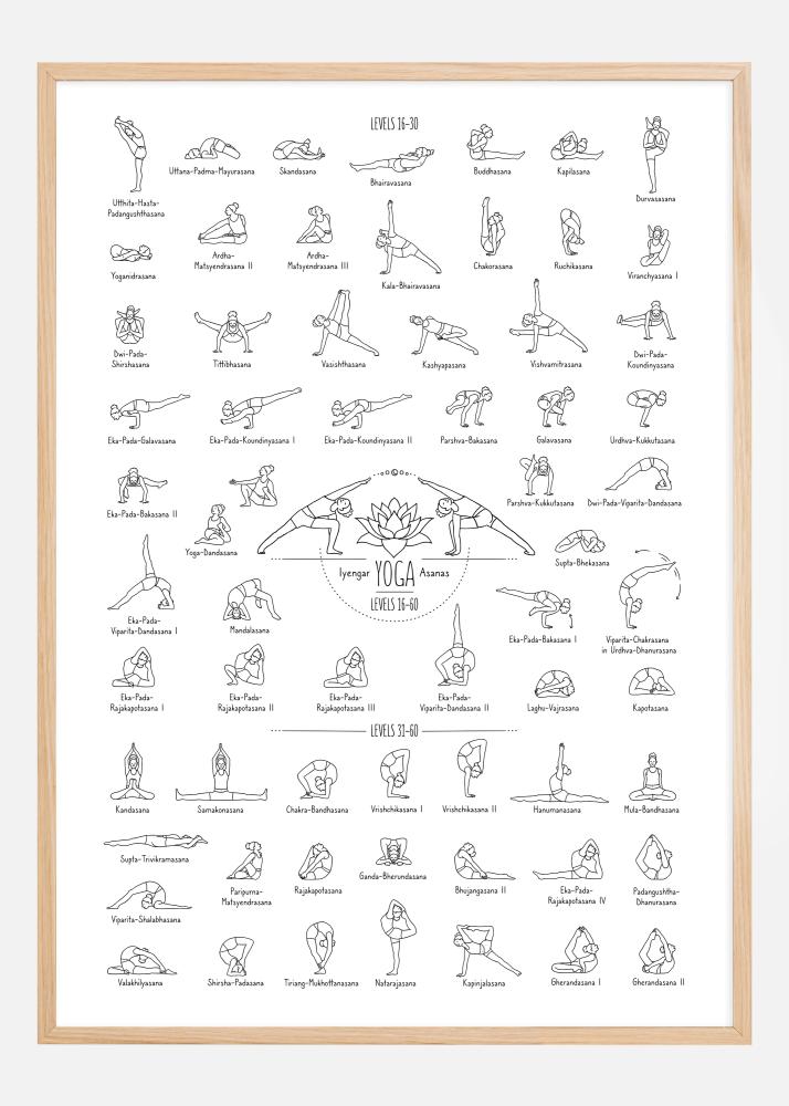 Αυτή η εκτενής και λεπτομερής αφίσα απεικονίζει μια ποικιλία από στάσεις γιόγκα, προσαρμοσμένες για ενδιάμεσους και προχωρημένους ασκούμενους. Κάθε στάση είναι προσεκτικά σχεδιασμένη με απλή γραμμική τέχνη, καθιστώντας εύκολη για τον θεατή την κατανόηση της μορφής και της κατεύθυνσης κάθε στάσης. Οι ασάνες είναι οργανωμένες σε στήλες ανάλογα με τη δυσκολία, από επίπεδο 16 έως 30, και κάθε στάση είναι σαφώς σημειωμένη με το παραδοσιακό σανσκριτικό όνομά της.