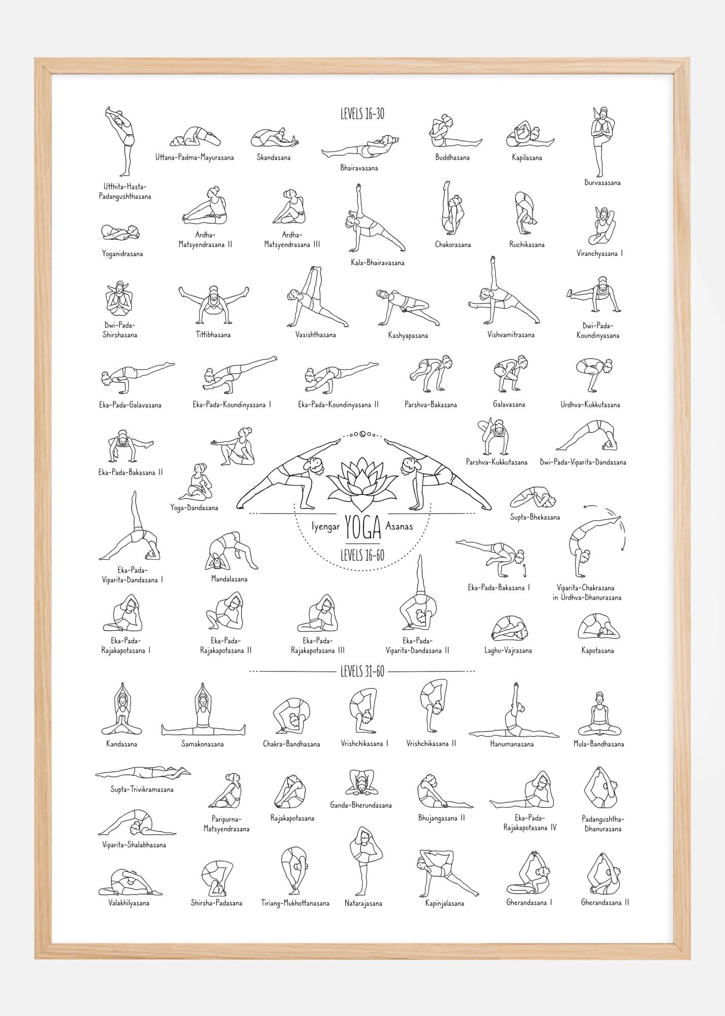 Στο κέντρο και στο επίκεντρο της αφίσας είναι ο τίτλος 'Iyengar YOGA Asanas' και τα επίπεδα δυσκολίας, που δείχνουν ότι αυτές οι ασκήσεις προέρχονται από τη συγκεκριμένη μορφή γιόγκα που αναπτύχθηκε από τον B.K.S. Iyengar. Αυτή η εκπαιδευτική αφίσα είναι ιδανική για έναν λάτρη της γιόγκα που θέλει να εμβαθύνει την πρακτική του καθώς και για εκπαιδευτές που χρειάζονται μια οπτική αναφορά στα στούντιο τους. Ο καθαρός και απλός σχεδιασμός της την καθιστά μια κομψή και λειτουργική διακόσμηση, ενώ συμβάλλει με μια εμπνευσμένη και εκπαιδευτική ατμόσφαιρα στο δωμάτιο.
