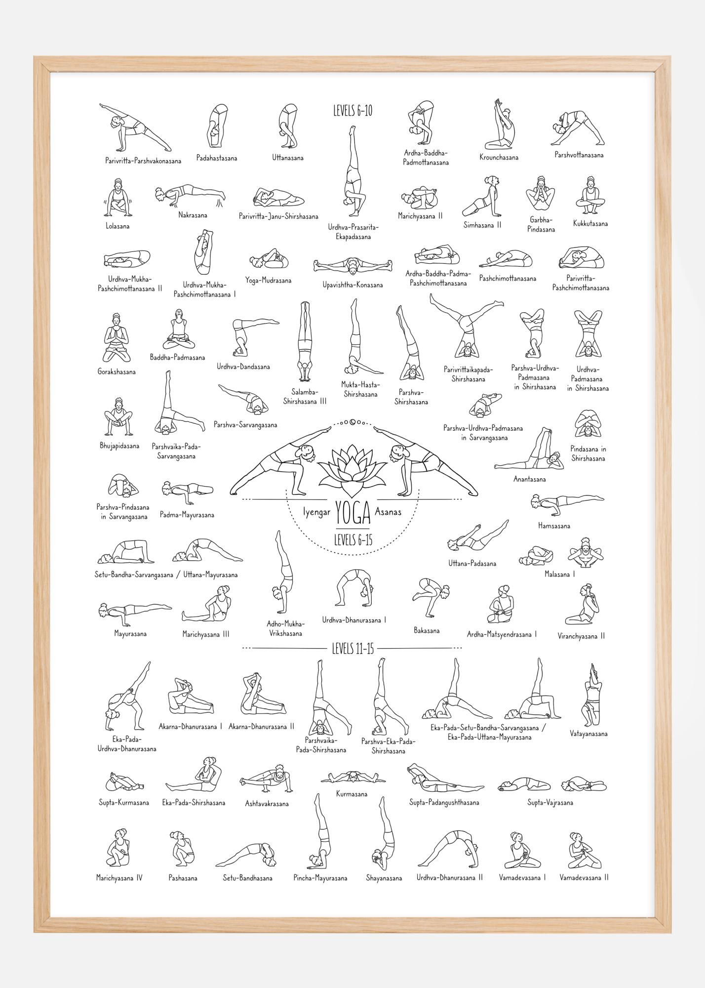 Αυτή η εκτενής και διδακτική αφίσα προσφέρει έναν οπτικό οδηγό για Iyengar Yoga Asanas για τα επίπεδα 6 έως 15, παρουσιασμένη με μια καθαρή και μεθοδική διάταξη. Οι λεπτομερείς εικονογραφήσεις απεικονίζονται με ακριβείς γραμμές που αναδεικνύουν τις μοναδικές φόρμες και τις στάσεις σε κάθε στάση γιόγκα. Πάνω από κάθε εικόνα βρίσκεται το όνομα της ασάνα στα σανσκριτικά, κάνοντας εύκολο για ασκούμενους όλων των επιπέδων να αναγνωρίσουν και να εξασκηθούν σε κάθε θέση.