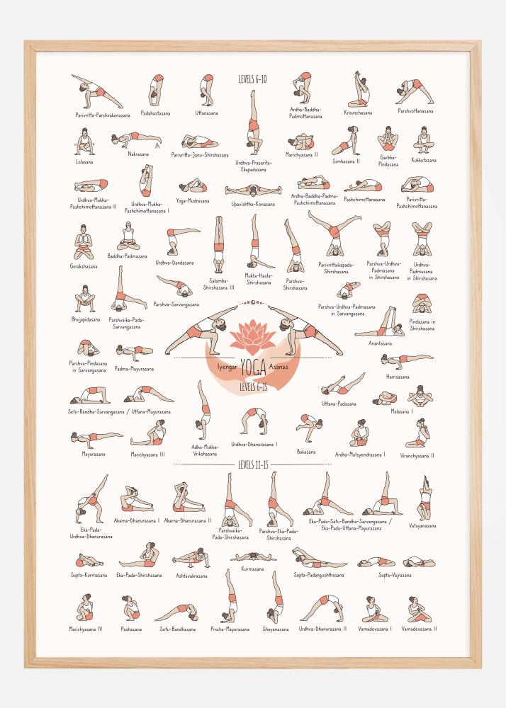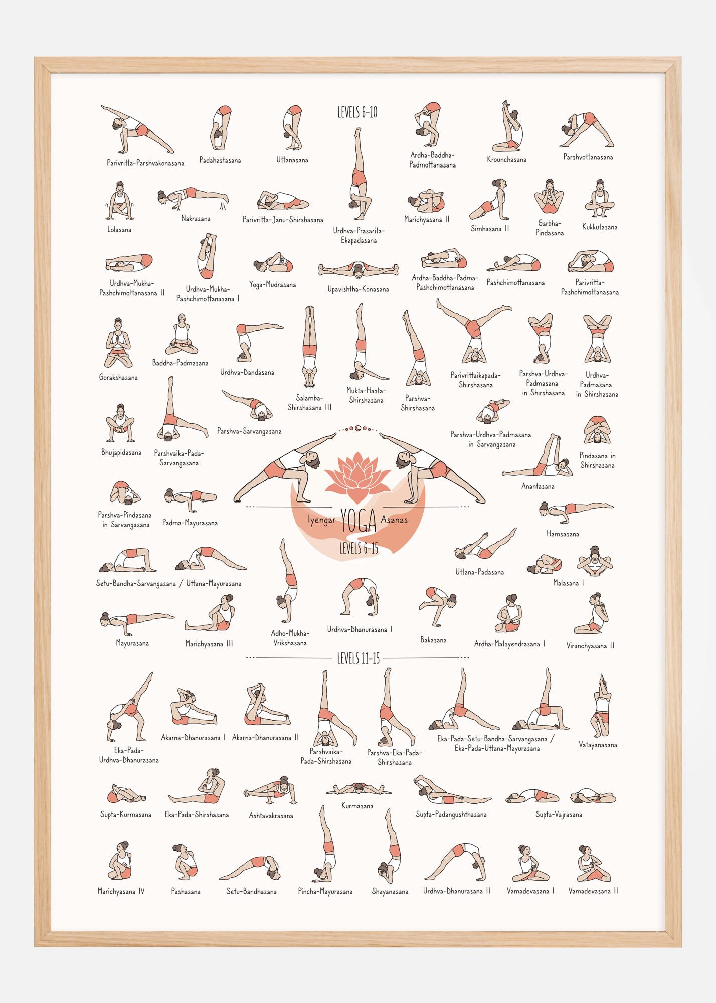 Αυτή η λεπτομερής και πολύχρωμη αφίσα γιόγκα απεικονίζει μια εκτενή συλλογή από Iyengar Yoga asanas από το επίπεδο 6 έως το 15. Κάθε στάση γιόγκα είναι ωραία απεικονισμένη με ζεστά, ευχάριστα χρώματα που τονίζουν κάθε μορφή και κίνηση, ενώ τα ευδιάκριτα ονόματα πλάι σε κάθε εικονογράφηση καθιστούν εύκολο να ακολουθήσετε και να εξασκηθείτε. Ο σχεδιασμός είναι τόσο λειτουργικός όσο και αισθητικός, δημιουργώντας μια φιλόξενη ατμόσφαιρα για ασκούμενους της γιόγκα όλων των επιπέδων γνώσεων.