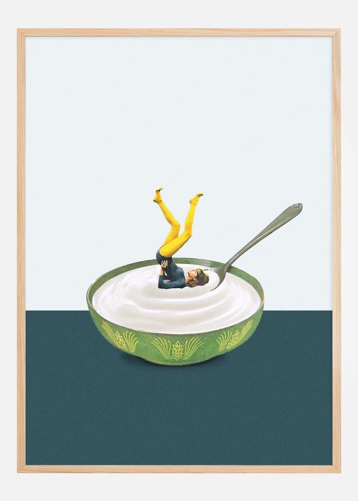 Αυτή η μοναδική και παιχνιδιάρικη αφίσα παρουσιάζει μια χιουμοριστική εικόνα ενός ατόμου που εκτελεί μια στάση γιόγκα βυθισμένο σε ένα μπολ με γιαούρτι, ολοκληρωμένη με ένα ζευγάρι παιχνιδιάρικα κίτρινα παντελόνια που ταιριάζουν με την αναποδογυρισμένη θέση. Η δημιουργική εικόνα συνδυάζει στοιχεία σουρεαλισμού και καθημερινού χιούμορ και αποτελεί μια αναζωογονητική παρέκκλιση από την παραδοσιακή τέχνη και διακόσμηση. Το δίχρωμο φόντο συμβάλλει στην ανάδειξη της ασυνήθιστης σύνθεσης και το καθιστά μια αφετηρία συζήτησης.