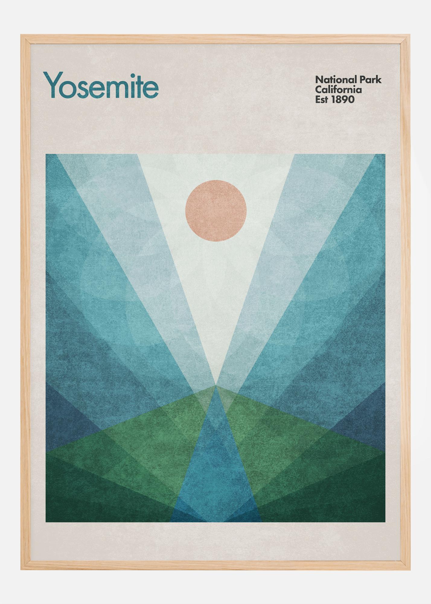 Αυτή η αφίσα αποτυπώνει το πνεύμα του Εθνικού Πάρκου Yosemite με έναν γεωμετρικό σχεδιασμό που αντικατοπτρίζει τα μεγαλοπρεπή και εμβληματικά τοπία του πάρκου. Με μια χρωματική παλέτα που θυμίζει καθαρούς ουρανούς και κατάφυτες κοιλάδες, το κείμενο "Yosemite National Park California Est 1890" αποτίει φόρο τιμής στην μακρά ιστορία του πάρκου ως εθνικό πάρκο και φυσικός θησαυρός.