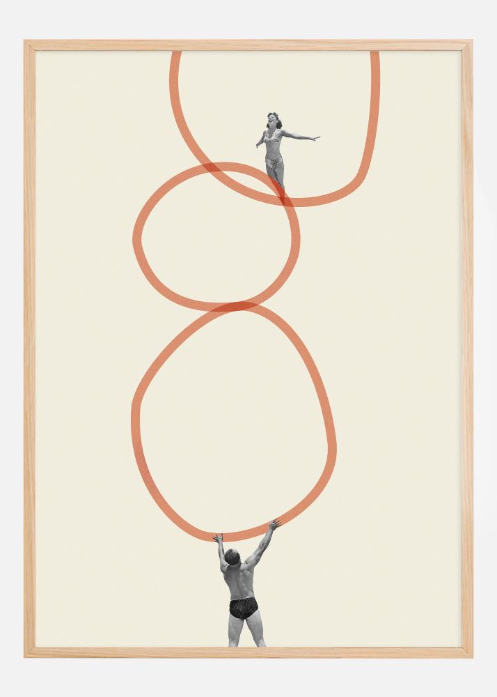Αυτή η μοναδική αφίσα παρουσιάζει μια σύνθεση που μοιάζει με χορό περιγραμμάτων και ανθρώπινη αλληλεπίδραση. Η εικόνα δείχνει ένα άτομο σε μια στροβιλιστική κίνηση, που ισορροπεί από μια άλλη φιγούρα που στέκεται δυνατή και σταθερή στο έδαφος, και οι δύο περιβάλλονται από ρευστούς κύκλους σε απόχρωση τερακότα-κόκκινο, που δημιουργούν μια αίσθηση κίνησης και συνέχειας.