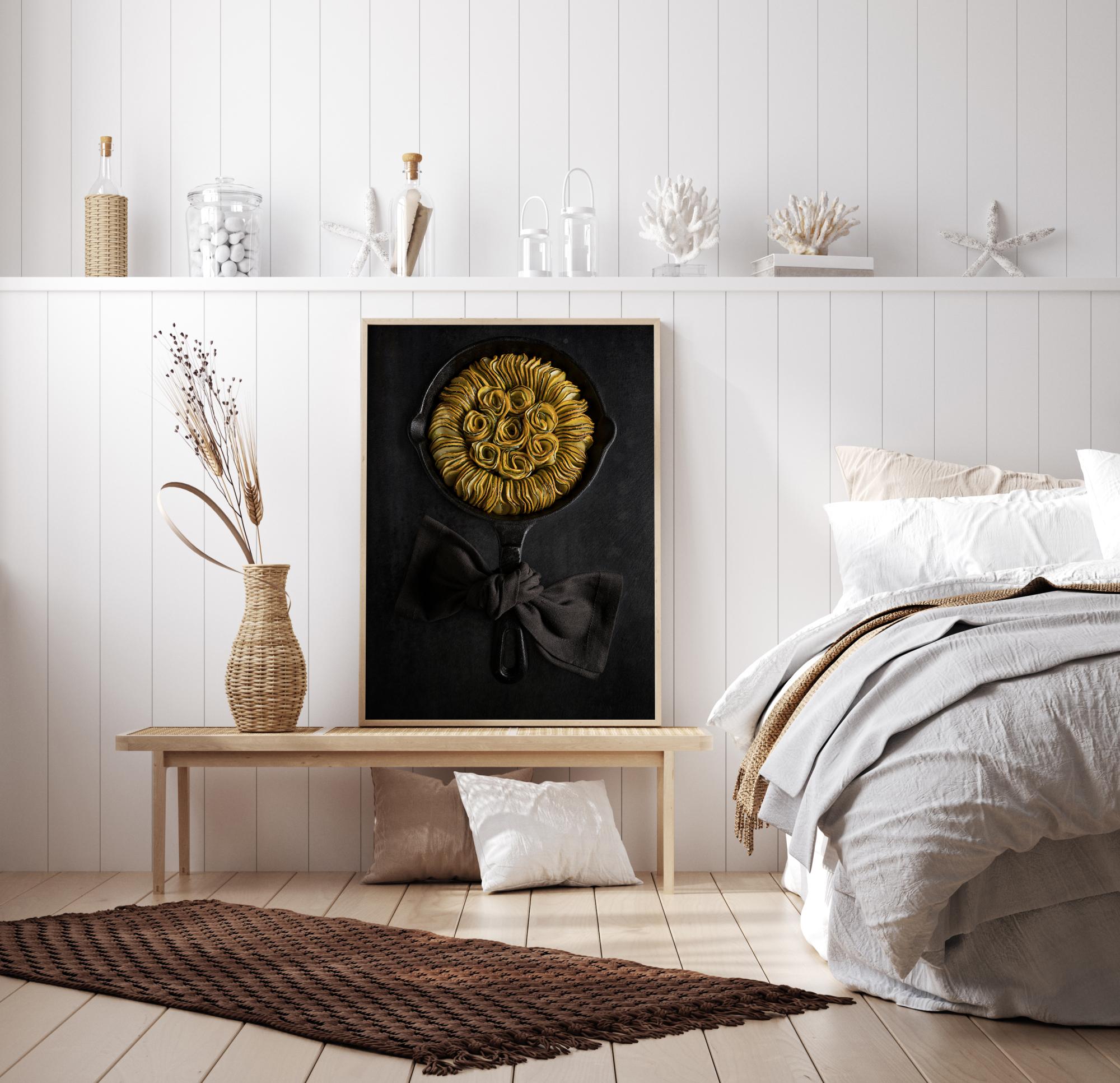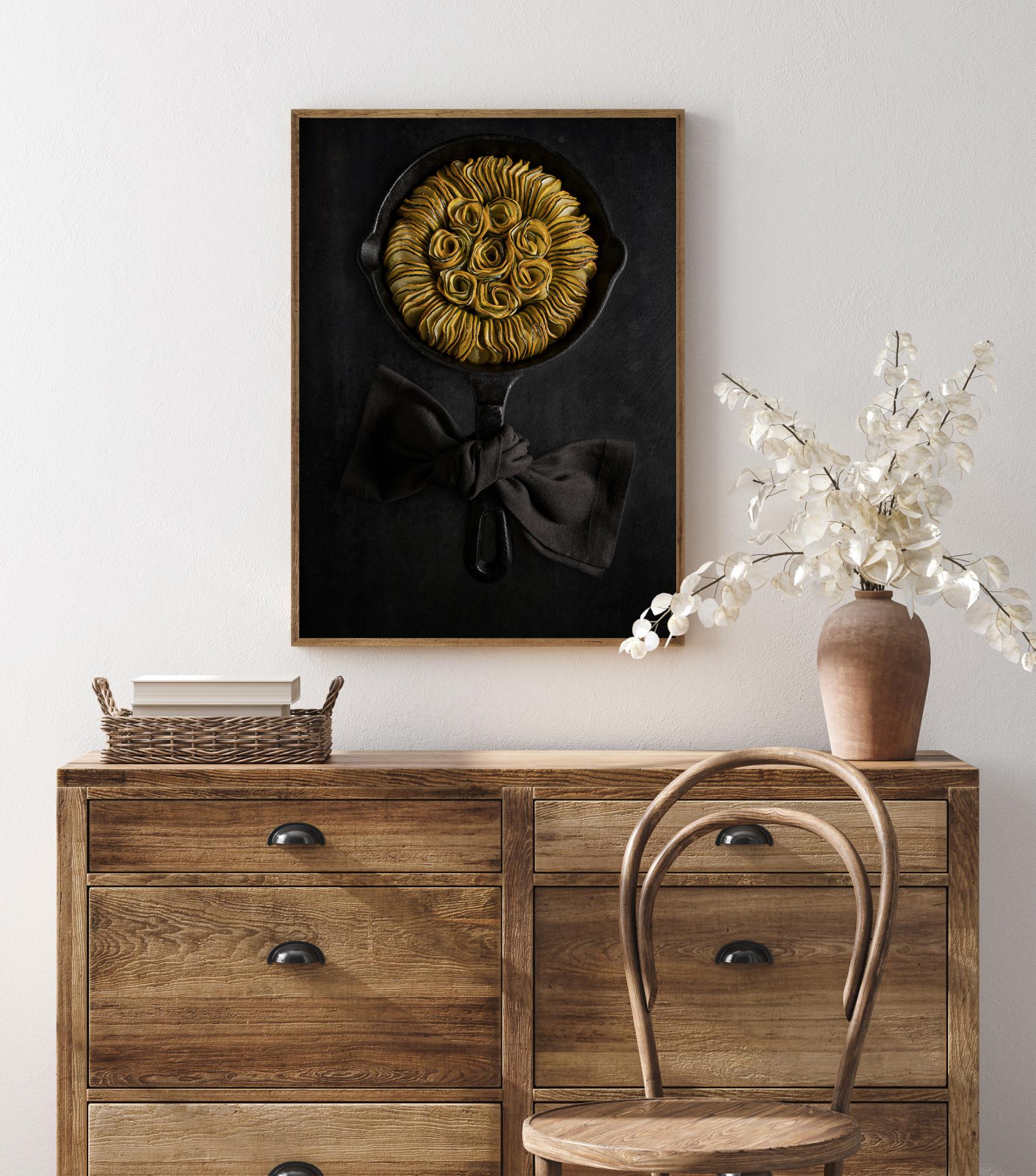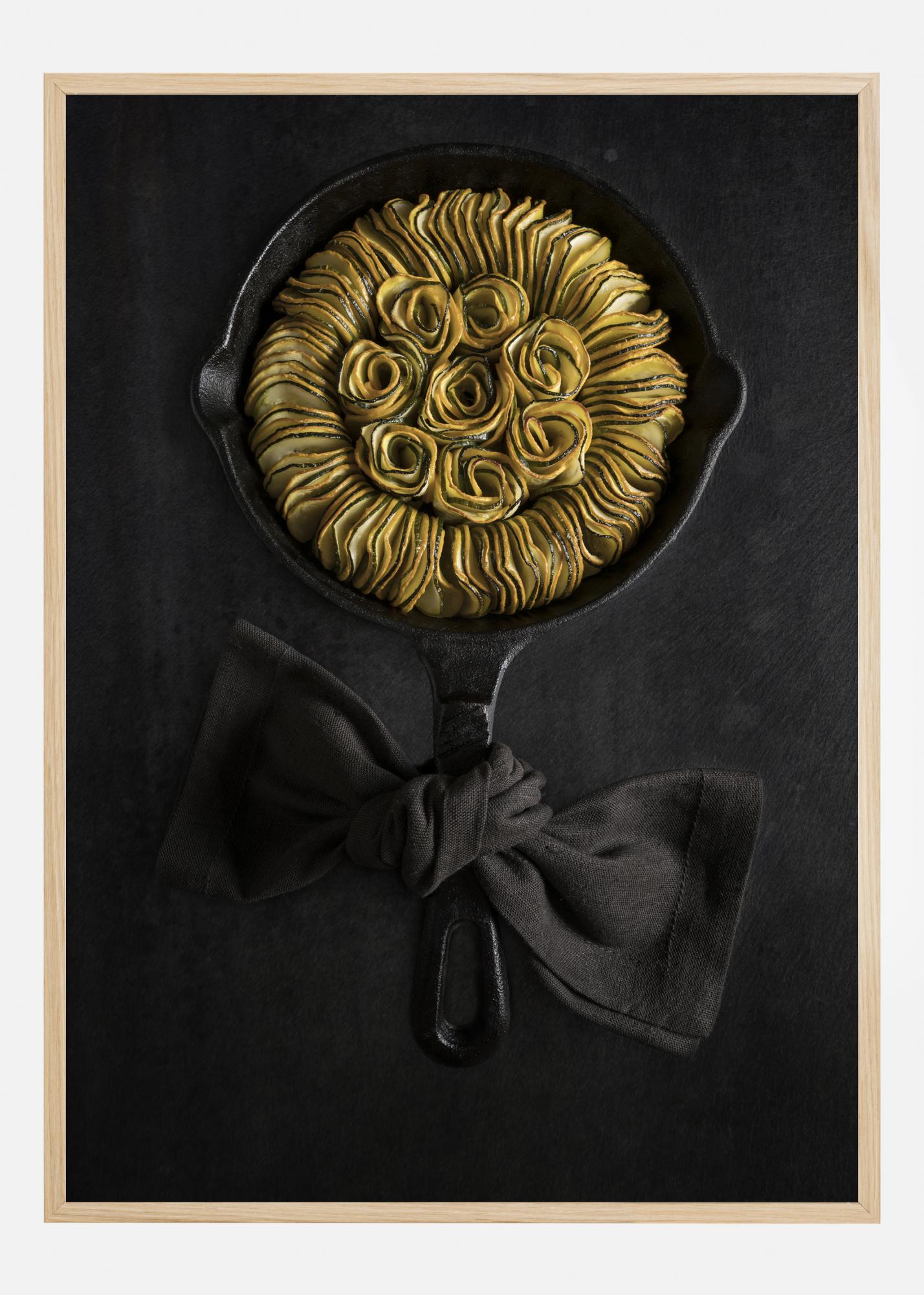 Μια νόστιμη αφίσα με ρατατούιγ με κολοκυθάκια ή σκουός που έχουν τοποθετηθεί κομψά σε ένα μαντεμένιο τηγάνι δημιουργώντας ένα υπέροχο σχήμα ηλιοτροπίου. Τα κίτρινα και πράσινα κολοκυθάκια ξεχωρίζουν στο μαύρο τηγάνι με ένα υφασμάτινο φιόγκο δεμένο γύρω από τη λαβή. Κρεμάστε αυτήν την αφίσα στην κουζίνα σας και δείτε αν μπορείτε να φτιάξετε αυτό το δελεαστικό πιάτο.